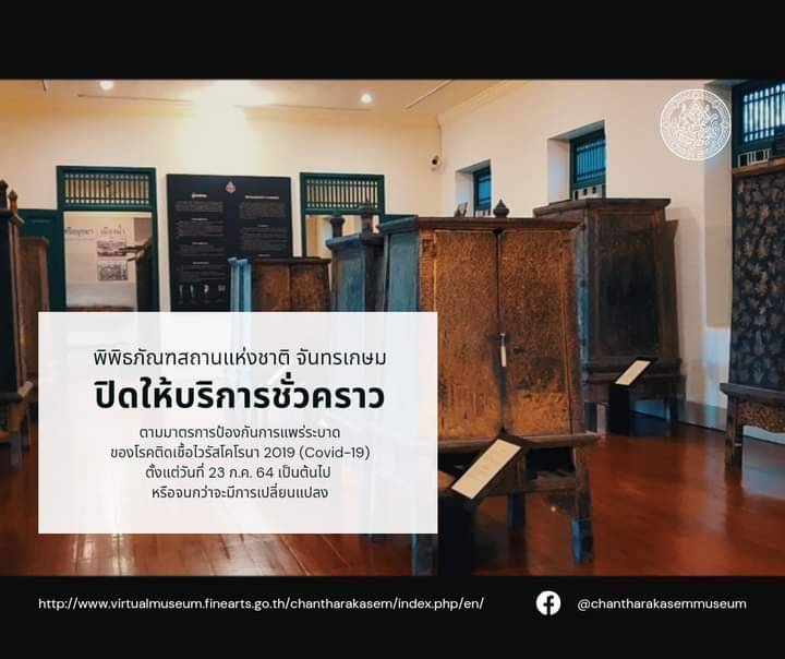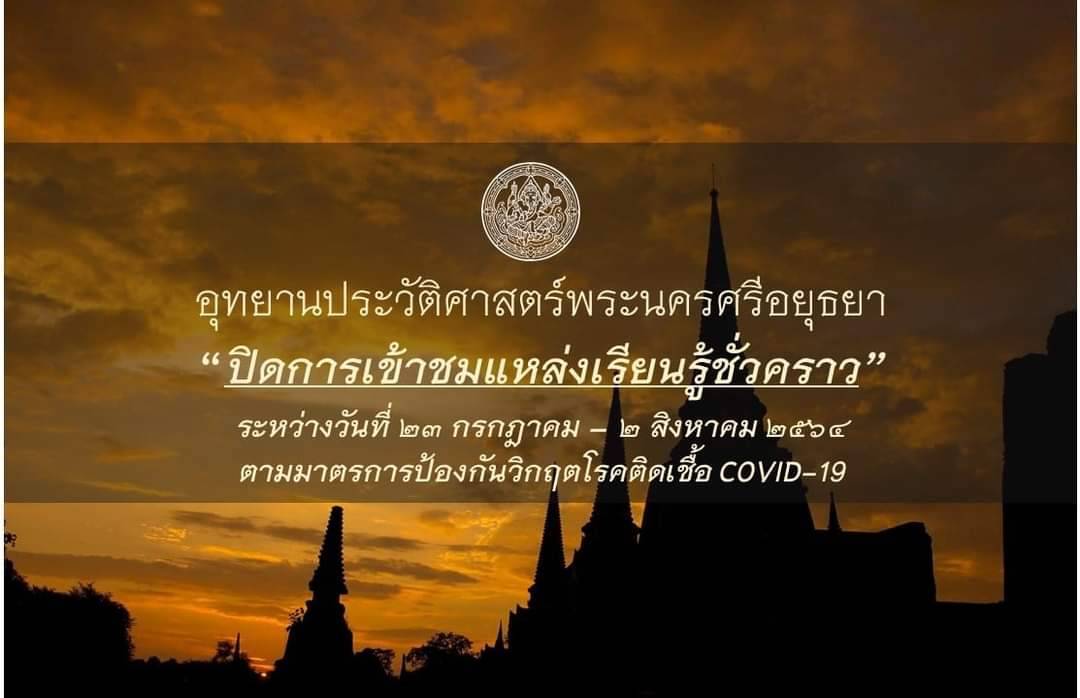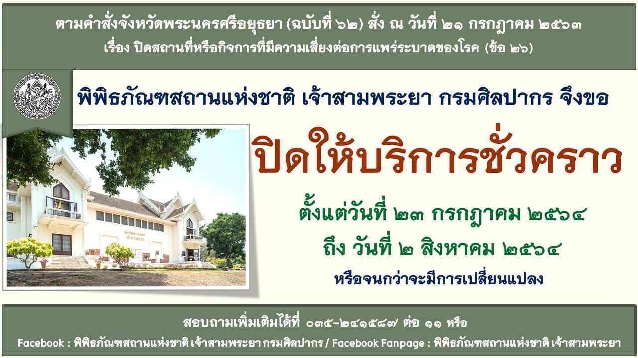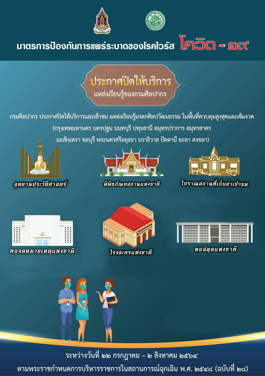 กรมศิลปากรประกาศปิดการให้บริการพิพิธภัณฑสถานแห่งชาติ อุทยานประวัติศาสตร์ โบราณสถานที่เก็บค่าเข้าชม หอสมุดแห่งชาติ และหอจดหมายเหตุ เป็นการชั่วคราว ลงวันที่ ๒๒ กรกฎาคม ๒๕๖๔