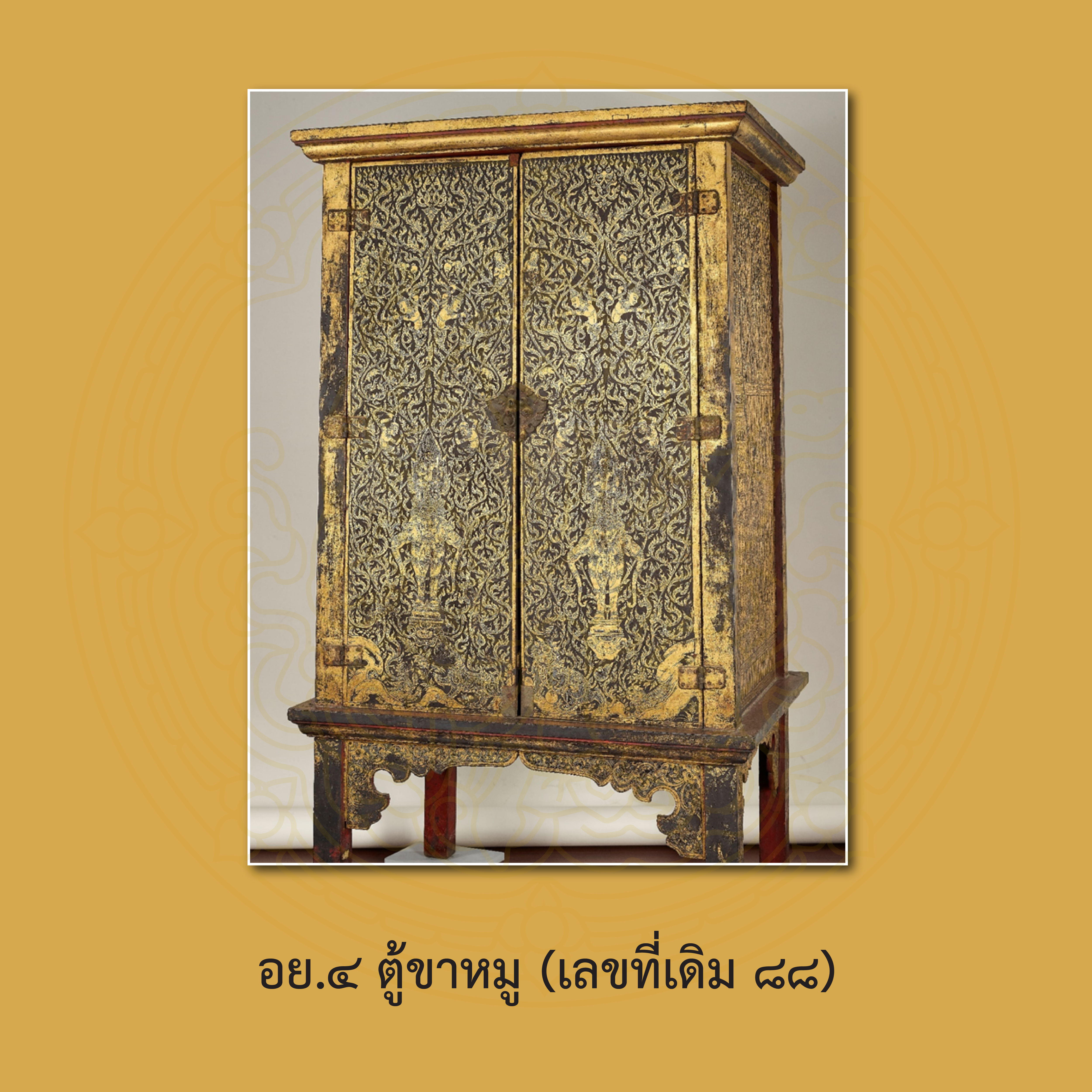 ตู้พระธรรม บนฐานแบบขาหมูเขียนภาพพุทธประวัติ ลายกนกเปลว เครือเถาไขว้และภาพสัตว์ต่างๆ (อย.๔)