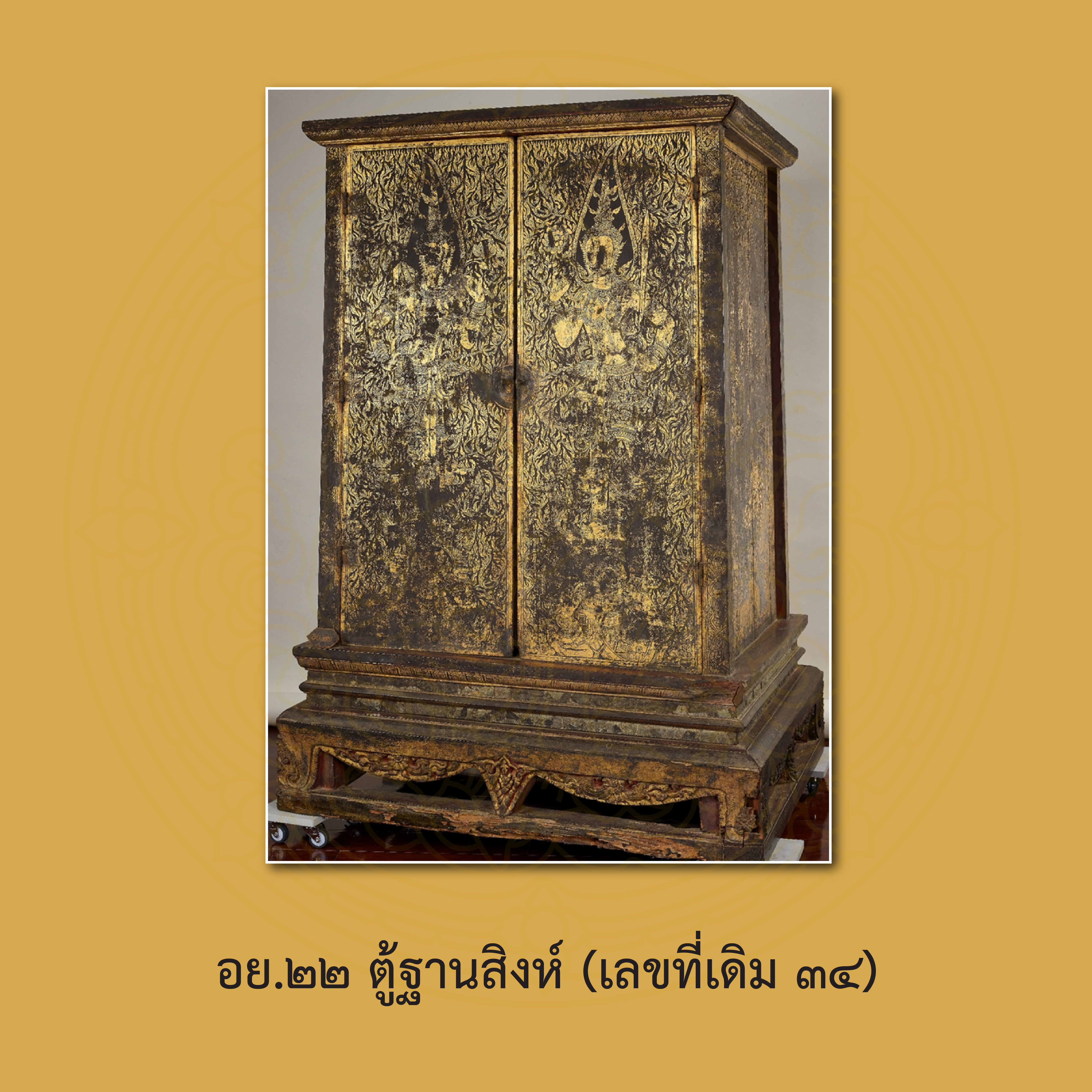 ตู้พระธรรม บนฐานสิงห์เขียนลายนาคคาบ ครุฑคาบ ออกเถา เทพนม เทพรำ ภาพคน สัตว์ ลายกนกเปลวเครือเถา (อย.๒๒)