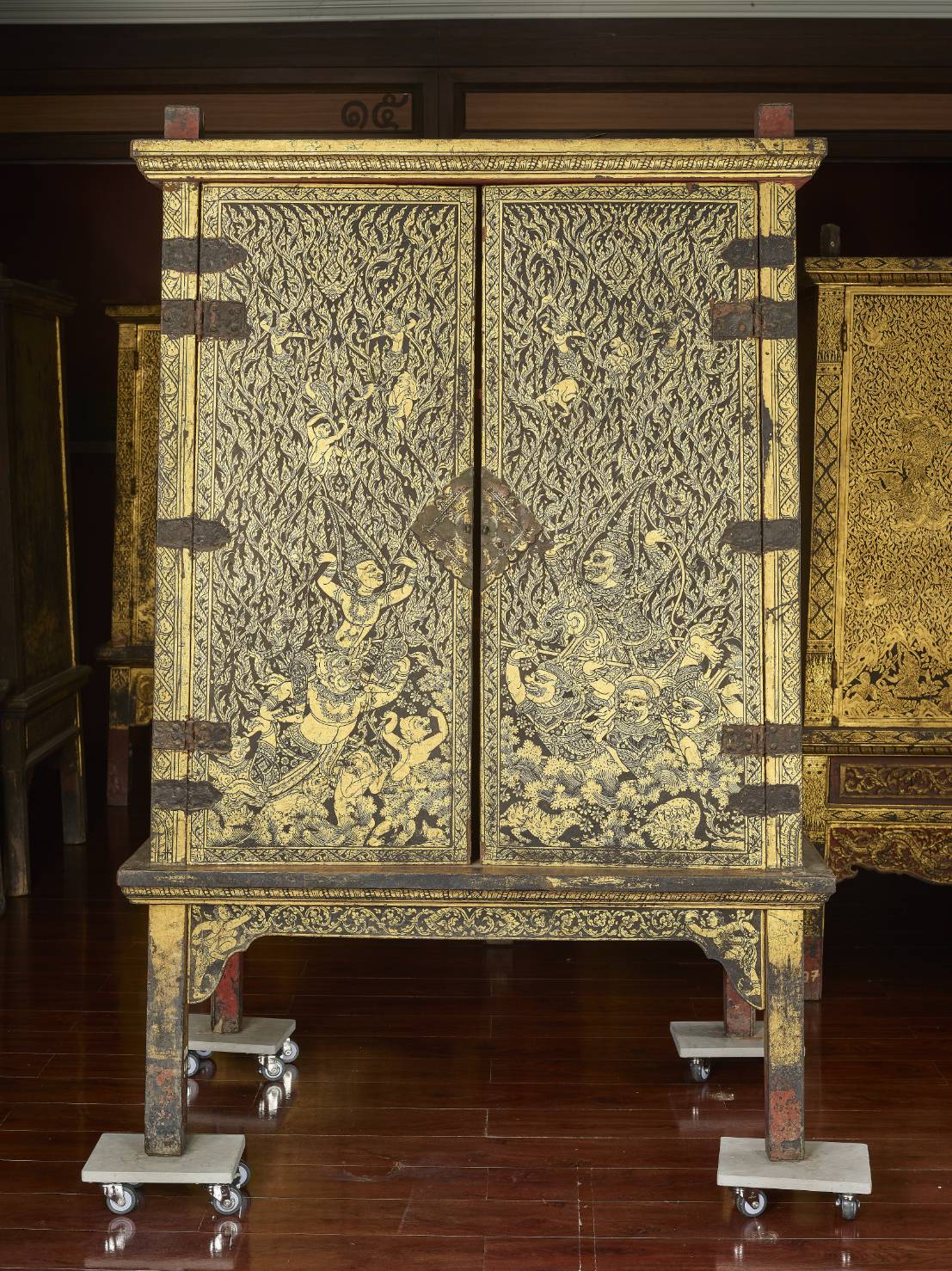 เมื่อวันที่ ๓๐ ตุลาคม ๒๔๖๕Manuscript Cabinet on pig-legged stand with scene from the Ramakien and a trellis of flame motifs and scrolling vine patterns interlocking bay. [BK.94, 84, 6]