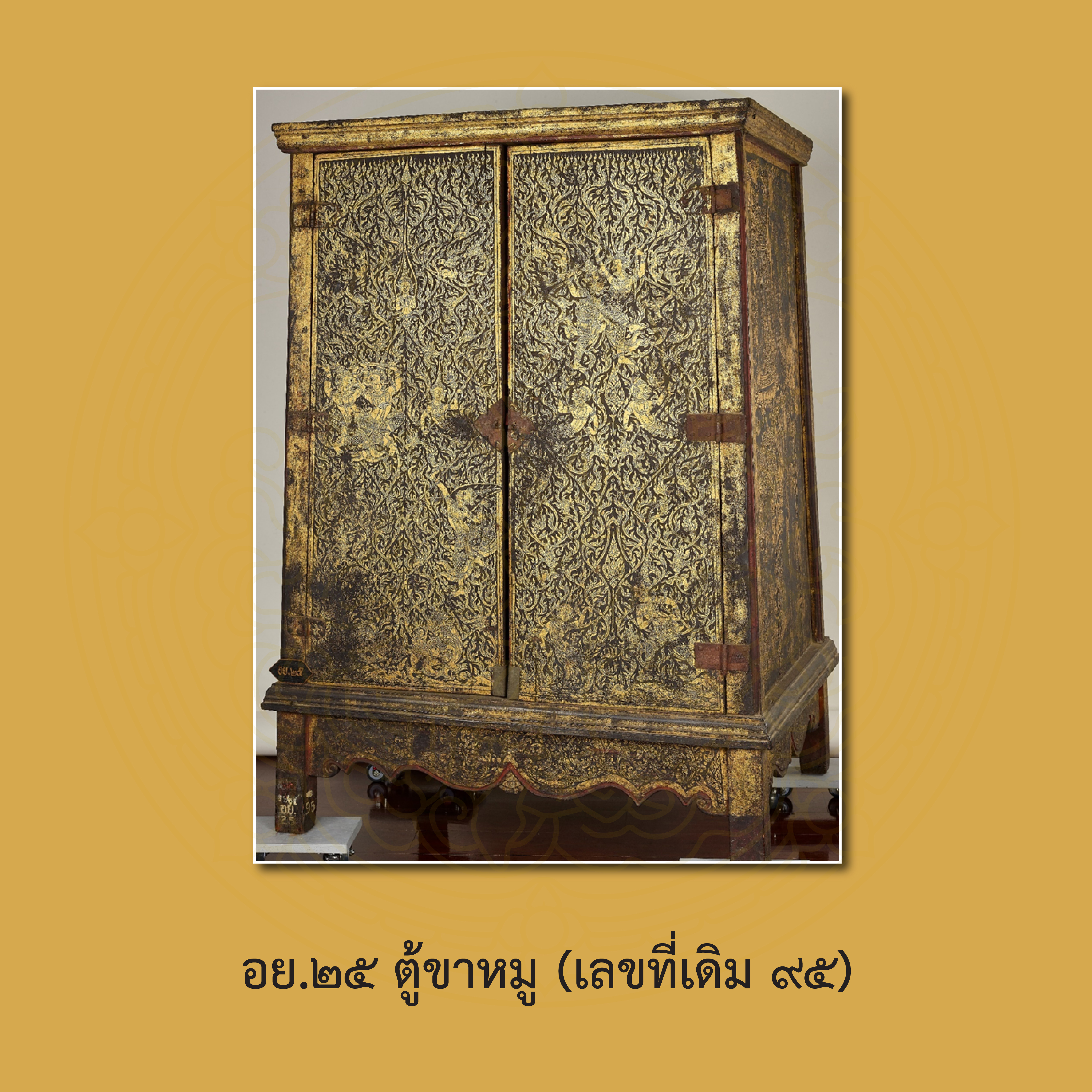 ตู้พระธรรม บนฐานแบบขาหมูเขียนภาพเล่าเรื่อง รามายณะ หัวราชสีห์หัวหงส์หัวสิงห์ลิง ยักษ์เทวดา รำ เทพนม นาคคาบ ครุฑคาบ ออกเถา หัวนาค หัวครุฑ เคล้าภาพสัตว์พุ่มข้าวบิณฑ์ลายกนกเปลว เครือเถาไขว้ (อย.๒๕)