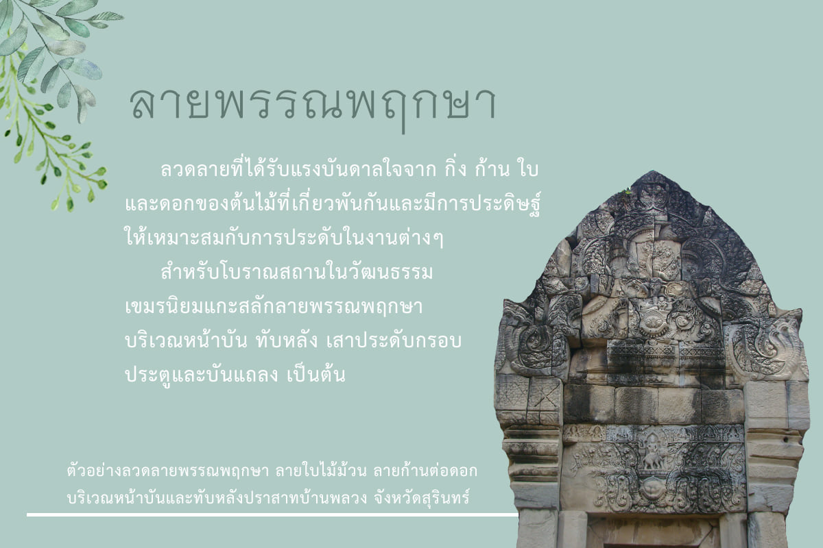 ลายพรรณพฤกษา คือลวดลายที่ได้รับแรงบันดาลใจจาก กิ่ง ก้าน ใบและดอกของต้นไม้ที่เกี่ยวพันกันและมีการประดิษฐ์ให้เหมาะสมกับการประดับในงานต่างๆ สำหรับโบราณสถานในวัฒนธรรมเขมรนิยมแกะสลักลายพรรณพฤกษาบริเวณหน้าบัน ทับหลัง เสาประดับกรอบประตูและบันแถลง เป็นต้น