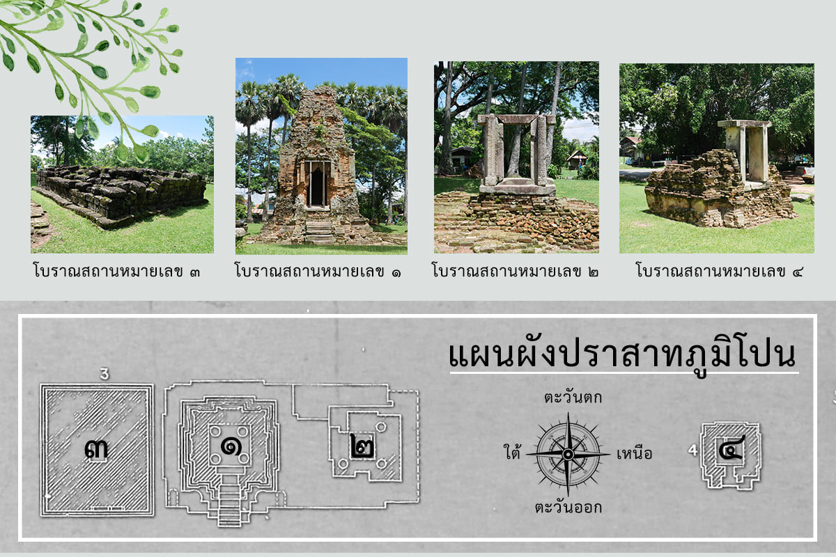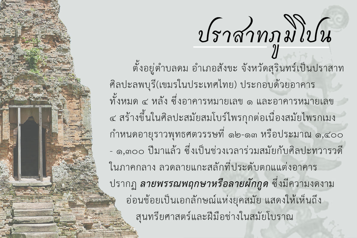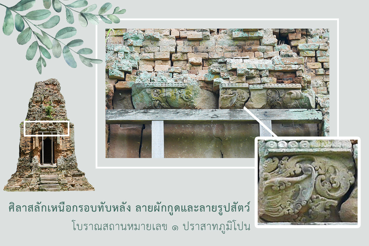 ปราสาทภูมิโปน ตั้งอยู่ตำบลดม อำเภอสังขะ จังหวัดสุรินทร์ เป็นปราสาทศิลปะลพบุรี(เขมรในประเทศไทย) ประกอบด้วยอาคารทั้งหมด ๔ หลัง ซึ่งอาคารหมายเลข ๑ และอาคารหมายเลข ๔ สร้างขึ้นในศิลปะสมัยสมโบร์ไพรกุกต่อเนื่องสมัยไพรกเมง กำหนดอายุราวพุทธศตวรรษที่ ๑๒ - ๑๓ หรือประมาณ ๑,๔๐๐ - ๑,๓๐๐ ปีมาแล้ว ซึ่งเป็นช่วงเวลาร่วมสมัยกับศิลปะทวารวดีในภาคกลาง ลวดลายแกะสลักที่ประดับตกแต่งอาคาร ปรากฏลายพรรณพฤกษาหรือลายผักกูด ซึ่งมีความงดงามอ่อนช้อยเป็นเอกลักษณ์แห่งยุคสมัย โดยปรากฏหลักฐานให้เห็นจากชิ้นส่วนประดับอาคาร ได้แก่ ศิลาสลักเหนือกรอบทับหลัง ลายผักกูดและลายรูปสัตว์จากโบราณสถานหมายเลข ๑ , ลายผักกูดที่ปรากฏแทรกอยู่บนทับหลังของโบราณสถานหมายเลข ๔ ,ลายพวงอุบะห้อยและลายผักกูดสลักบนเสาประดับกรอบประตูของโบราณสถานหมายเลข ๔