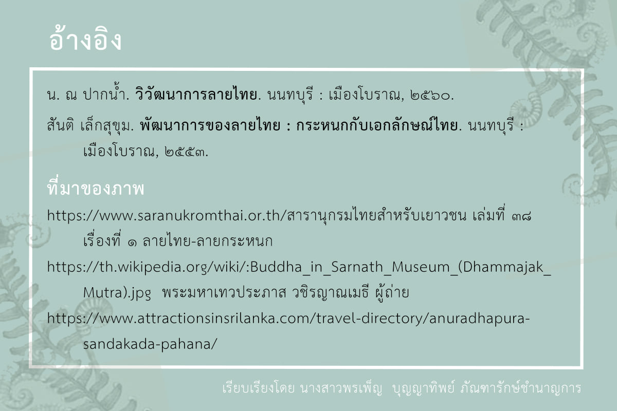 - น. ณ ปรากน้ำ. วิวัฒนาการลายไทย. นนทบุรี : เมืองโบราณ, ๒๕๖๐