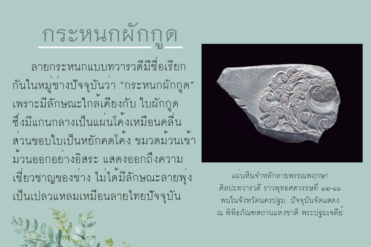 ลายกระหนกแบบทวารวดี มีชื่อเรียกกันในหมู่ช่างปัจจุบันว่า "กระหนกผักกูด" เพราะมีลักษณะใกล้เคียงกับใบผักกูด ซึ่งมีแกนกลางเป็นแผ่นโค้ง ขมวดม้วนเข้าม้วนออกอย่างอิสระ แสดงออกถึงความเชี่ยวชาญของช่าง ไม่ได้มีลักษณะลายพุ่งเป็นเปลวแหลมเหมือนลายไทยปัจจุบัน