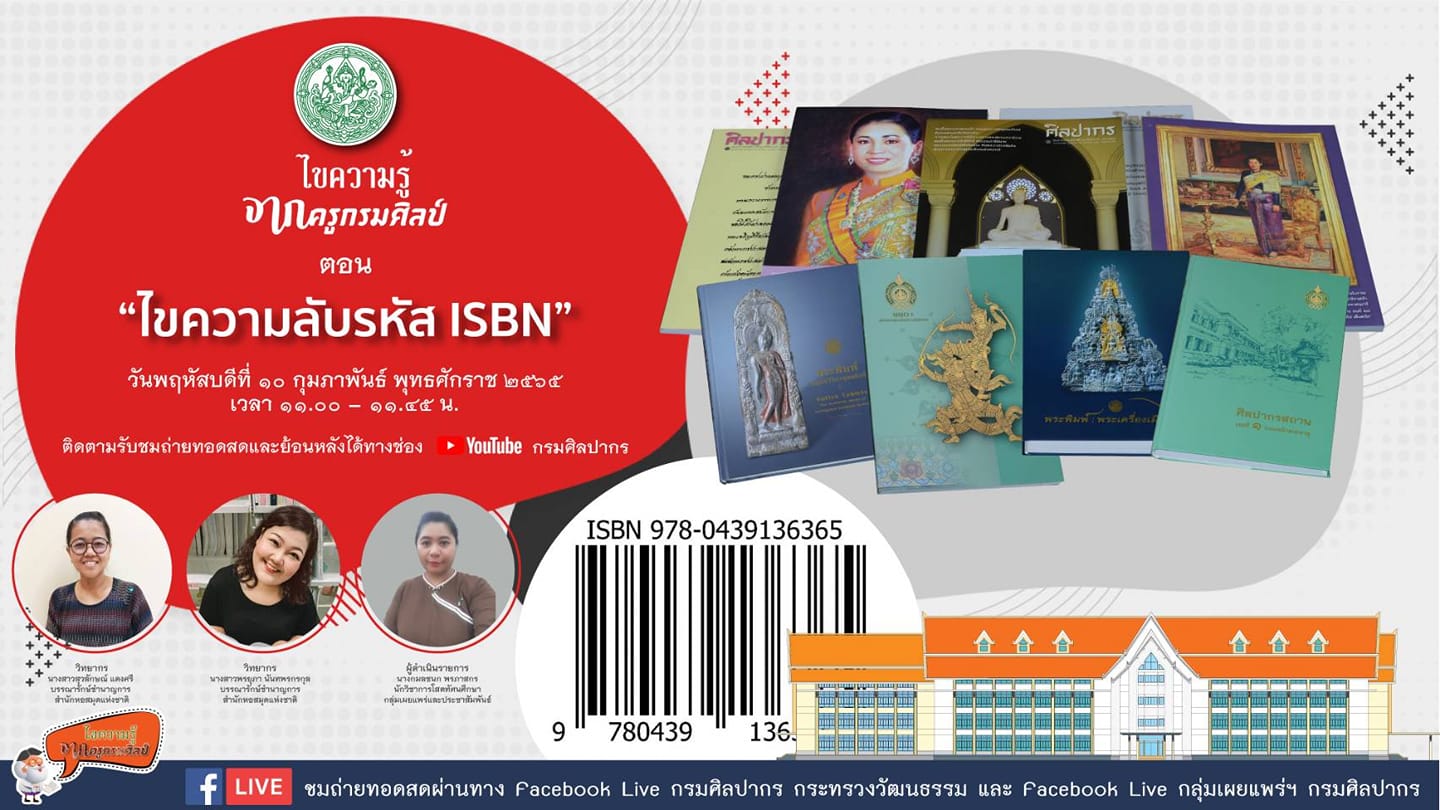 ขอเชิญรับชมถ่ายทอดสด Facebook Live รายการ ไขความรู้จากครูกรมศิลป์ ตอน “ไขความลับรหัส ISBN” ในวันพฤหัสบดีที่ ๑๐ กุมภาพันธ์ ๒๕๖๕ เวลา ๑๑.๐๐ - ๑๑.๔๕ น.