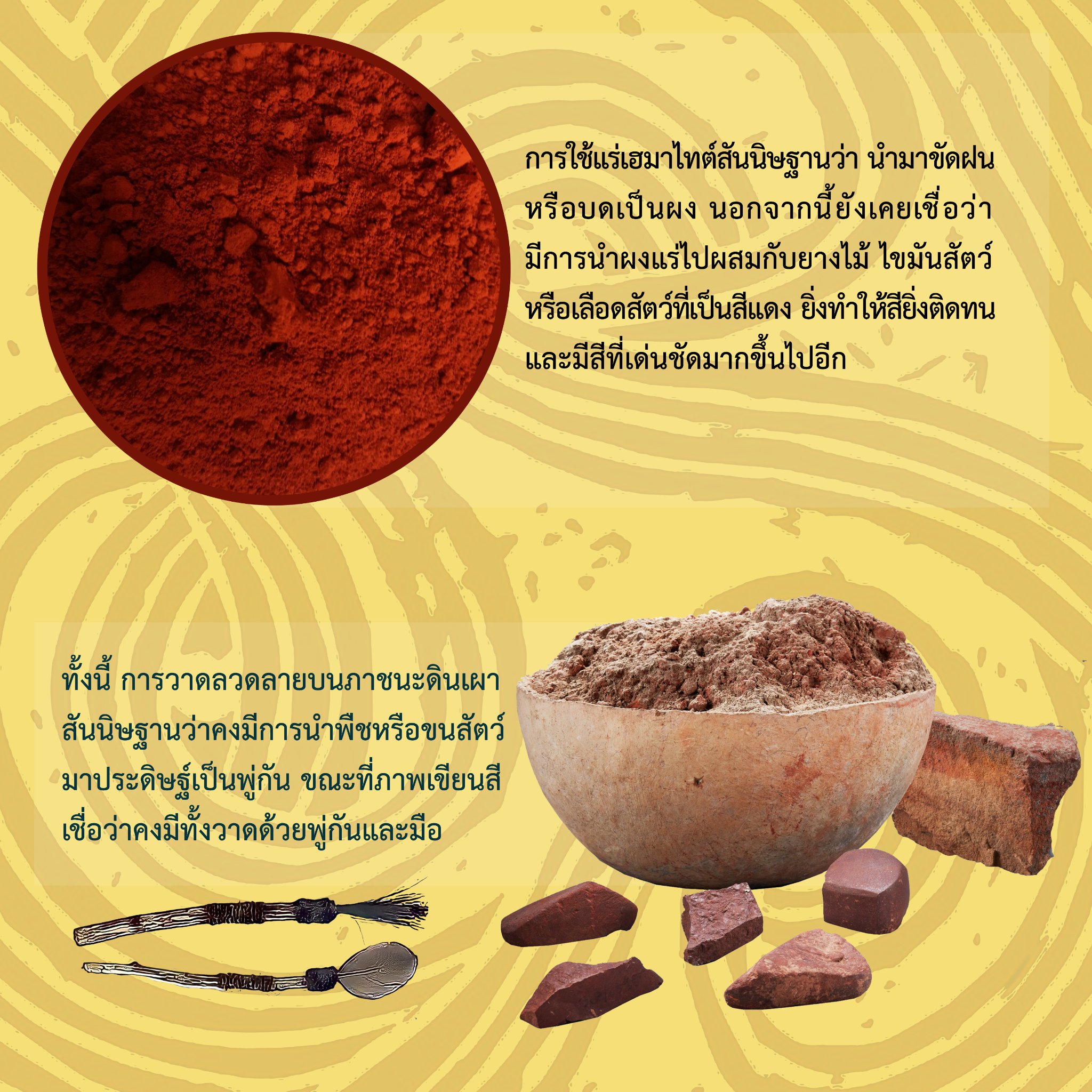 หลักฐานการขุดค้นทางโบราณคดีที่ผาแต้ม จังหวัดอุบลราชธานี เมื่อปี พ.ศ. 2535 พบว่ามีการนำแร่เฮมาไทต์มาขัดฝนเพื่อนำไปใช้งาน โดยมีการสันนิษฐานว่าคงนำแร่มาบดเป็นผงเสียก่อน แล้วอาจนำไปผสมกับยางไม้ ไขมันสัตว์ หรือเลือดสัตว์ที่เป็นสีแดงเช่นเดียวกับแร่ ซึ่งยิ่งทำให้สียิ่งติดทนและมีสีที่เด่นชัดมากขึ้นไปอีก อย่างไรก็ตาม การที่ดินแดนไทยพบการใช้สีแดงอย่างแพร่หลาย อาจเนื่องด้วยแร่ชนิดดังกล่าวเป็นวัตถุดิบที่พบมากที่สุด