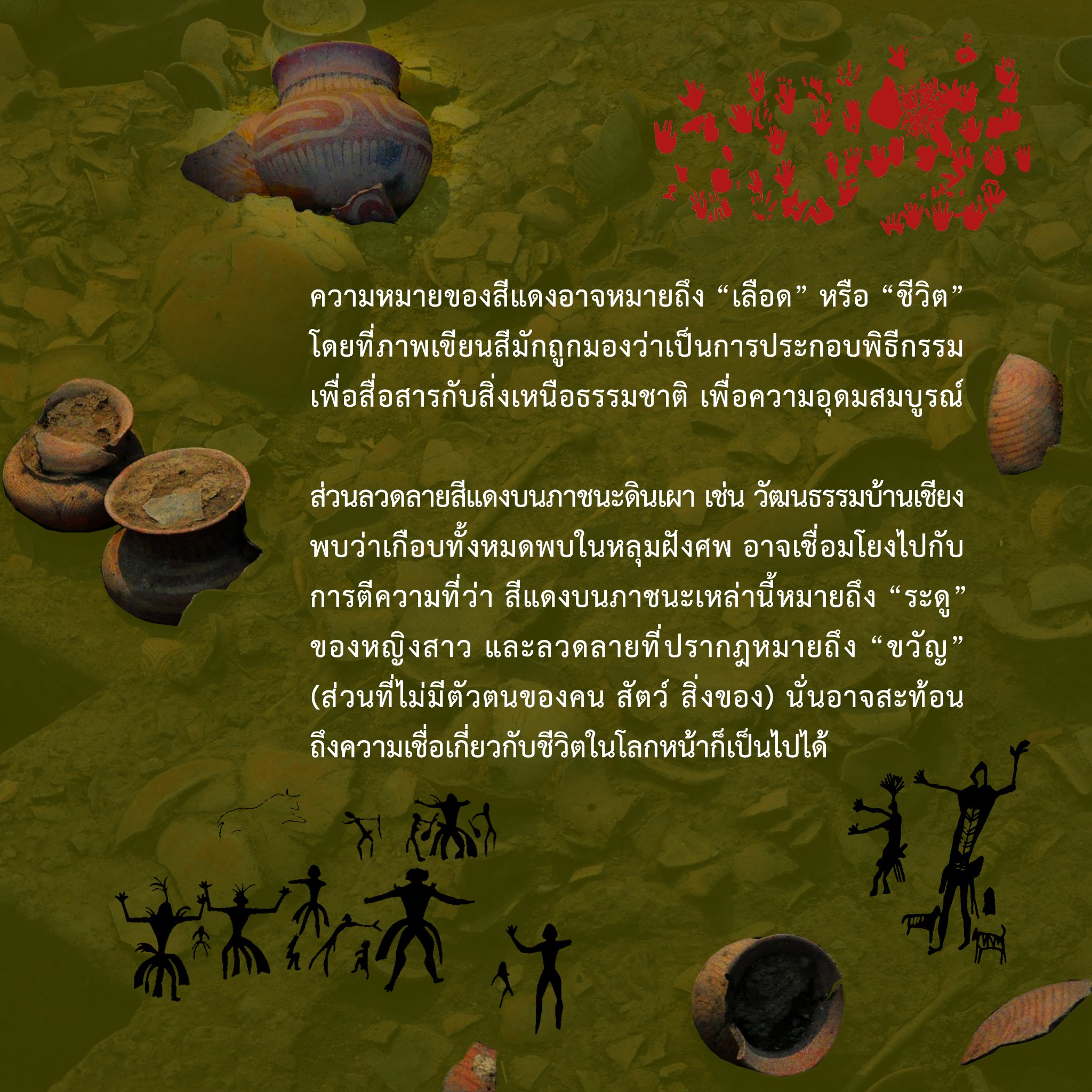 ส่วนการใช้สีแดงสื่อความหมายใดหรือไม่นั้น ได้มีผู้ให้ความเห็นไว้ว่าสื่อถึง "เลือด" และ "ชีวิต" ซึ่งหากเป็นภาพเขียนสีมักตีความภาพเหล่านี้ไปในทางการประกอบพิธีกรรมและร่วมกันเขียนภาพสื่อสารกับสิ่งเหนือธรรมชาติ เพื่อความอุดมสมบูรณ์ ขณะเดียวกัน ลวดลายสีแดงบนภาชนะดินเผาในวัฒนธรรมบ้านเชียง อาจสื่อความหมายถึง "ขวัญ" (ส่วนที่ไม่มีตัวตนของคน สัตว์ สิ่งของ)