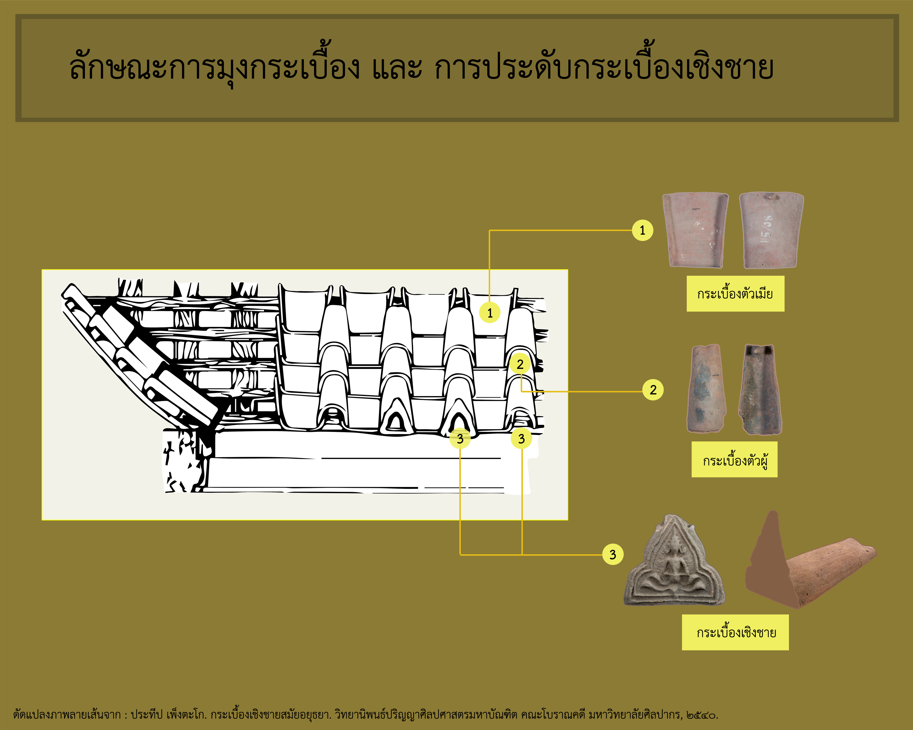 คณะกรรมการดำเนินงานจัดทำศัพทานุกรมด้านโบราณคดีและพิพิธภัณฑ์. ศัพทานุกรมโบราณคดี. กรุงเทพฯ : บริษัท รุ่งศิลป์การพิมพ์ (๑๙๗๗) จำกัด, ๒๕๕๐. ประทีป เพ็งตะโก. กระเบื้องเชิงชายสมัยอยุธยา. วิทยานิพนธ์ปริญญาศิลปศาสตรมหาบัณฑิต คณะโบราณคดี มหาวิทยาลัยศิลปากร, ๒๕๔๐. ปริวรรต ธรรมาปรีชากร และคณะ. ศิลปะเครื่องถ้วยในประเทศไทย. พิมพ์ครั้งที่ ๒. กรุงเทพฯ : บริษัท โอสถสภาจำกัด, ๒๕๓๙. วิบูลย์ ลี้สุวรรณ. พจนานุกรมศัพท์ศิลปกรรมไทย. นนทบุรี : เมืองโบราณ, ๒๕๕๙. สำนักงานราชบัณฑิตยสภา. พจนานุกรมฉบับราชบัณฑิตยสถานพุทธศักราช ๒๕๕๔. กรุงเทพฯ : สำนักงานราชบัณฑิตยสภา, ๒๕๕๔.