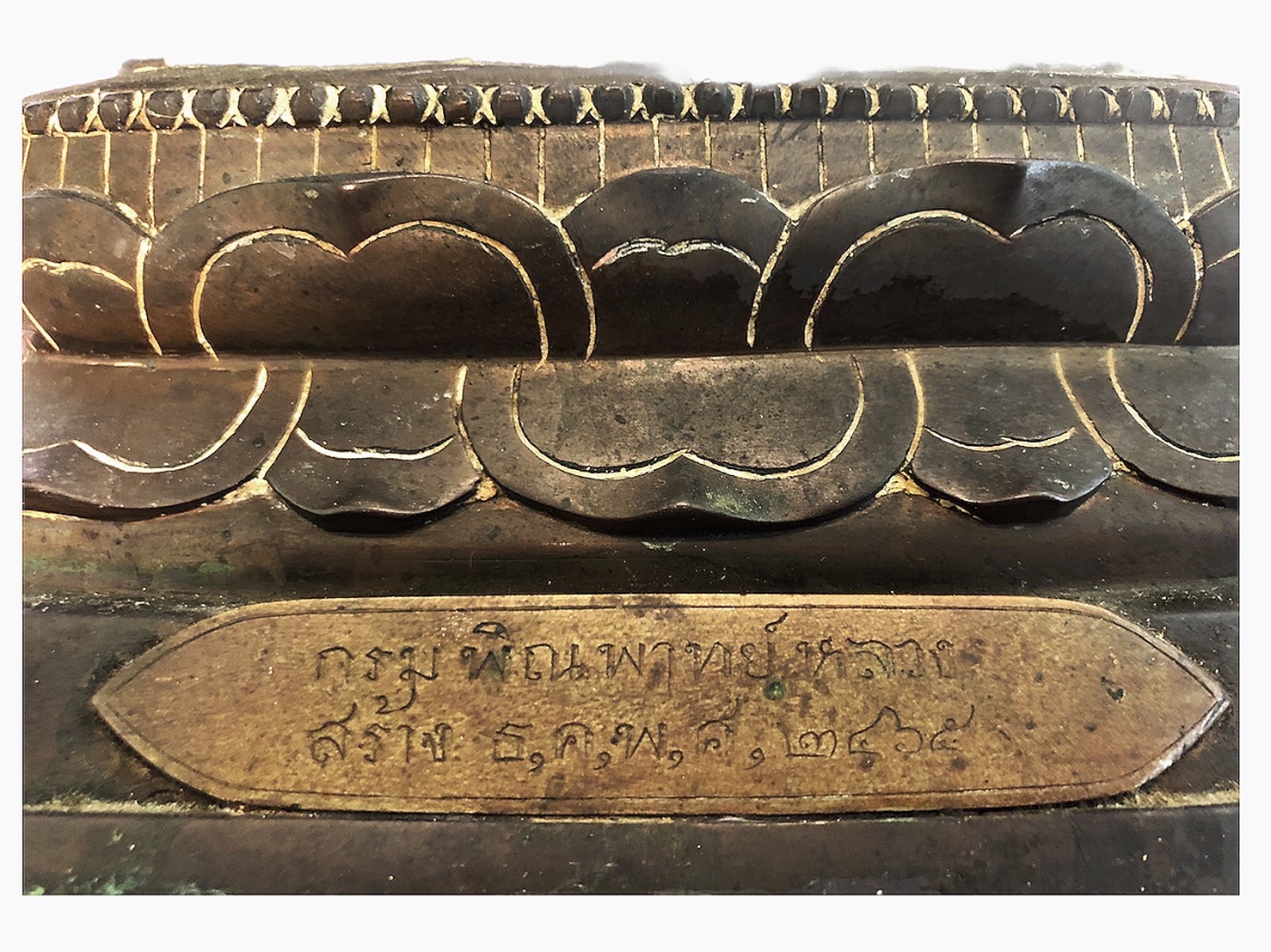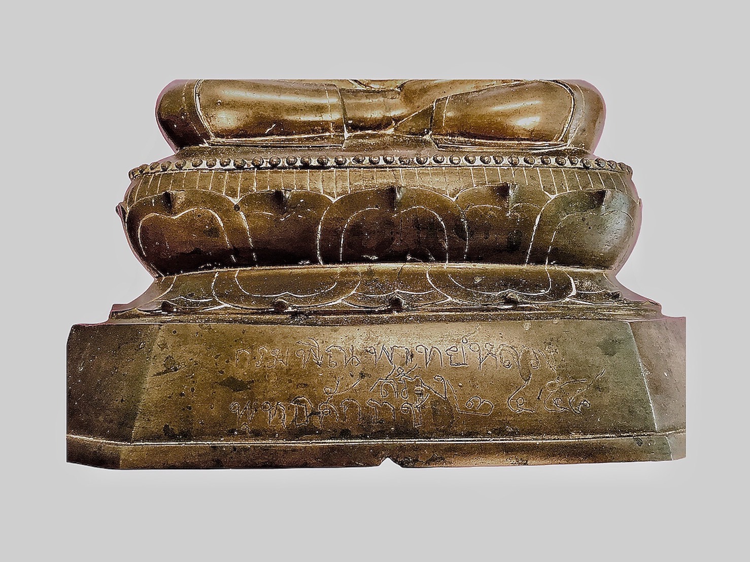 ๑) พระพุทธรูปองค์ที่บริเวณด้านหน้าของฐานมีป้ายโลหะแกะสลักว่า “กรมพิณพาทย์หลวง สร้าง ธ,ค,พ,ศ, ๒๔๖๕”พระพุทธรูปองค์นี้สร้างแล้วเสร็จในเดือนธันวาคม พุทธศักราช ๒๔๖๕และได้มอบให้กรมมหรสพในเดือนมกราคม พุทธศักราช ๒๔๖๕ (การขึ้นศักราชใหม่ก่อนวันที่ ๑ มกราคม พุทธศักราช ๒๔๘๔ นั้น แต่เดิมเริ่มนับวันที่ ๑ เมษายน เป็นวันขึ้นศักราชใหม่)ตามที่ปรากฏในราชกิจจานุเบกษา