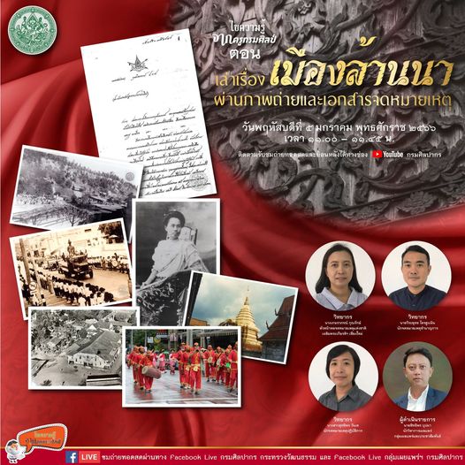 กรมศิลปากร ขอเชิญรับชมถ่ายทอดสด Facebook Live รายการ ไขความรู้จากครูกรมศิลป์ “เล่าเรื่องเมืองล้านนาผ่านภาพถ่ายและเอกสารจดหมายเหตุ” วิทยากรโดย นางเกษราภรณ์ กุณรักษ์ หัวหน้าหอจดหมายเหตุแห่งชาติเฉลิมพระเกียรติฯ เชียงใหม่, นายวีระยุทธ ไตรสูงเนิน นักจดหมายเหตุชำนาญการ และนางสาวสุทธิพร วันเต นักจดหมายเหตุปฏิบัติการ ดำเนินรายการโดย นายสิทธิพร บุปผา นักวิชาการเผยแพร่ กลุ่มเผยแพร่และประชาสัมพันธ์ ในวันพฤหัสบดีที่ ๕ มกราคม พุทธศักราช ๒๕๖๖ เวลา ๑๑.๐๐ – ๑๑.๔๕ น. ผู้สนใจสามารถติดตามชมได้ทาง Facebook Live : กรมศิลปากร กระทรวงวัฒนธรรม และ Facebook Live : กลุ่มเผยแพร่ฯ กรมศิลปากร