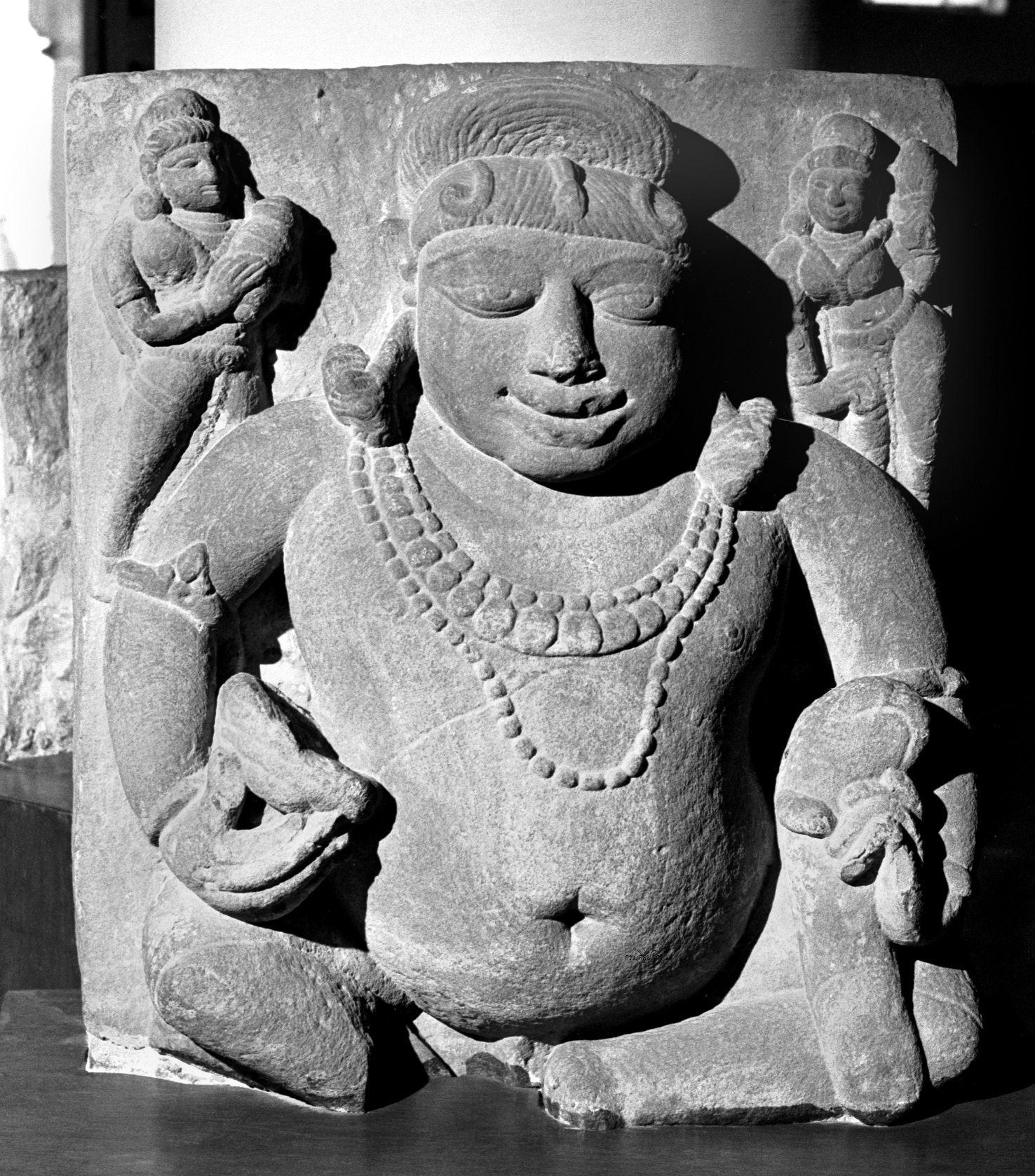 ภาพ: กุเวร ศิลปะอินเดียภาคเหนือพุทธศตวรรษที่ ๑๖ มีรูปเป็นคนแคระ ท้องใหญ่แสดงความอุดมสมบูรณ์ สวมเครื่องประดับเพชรพลอยและไข่มุก มือข้างหนึ่งถือภาชนะ ข้างหนึ่งถือพังพอนมีบริวารสตรีสองข้างถือหม้อบรรจุทรัพย์สินมีค่าและแส้จามร