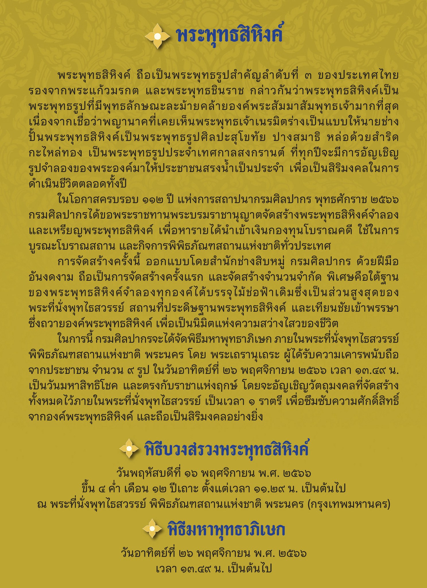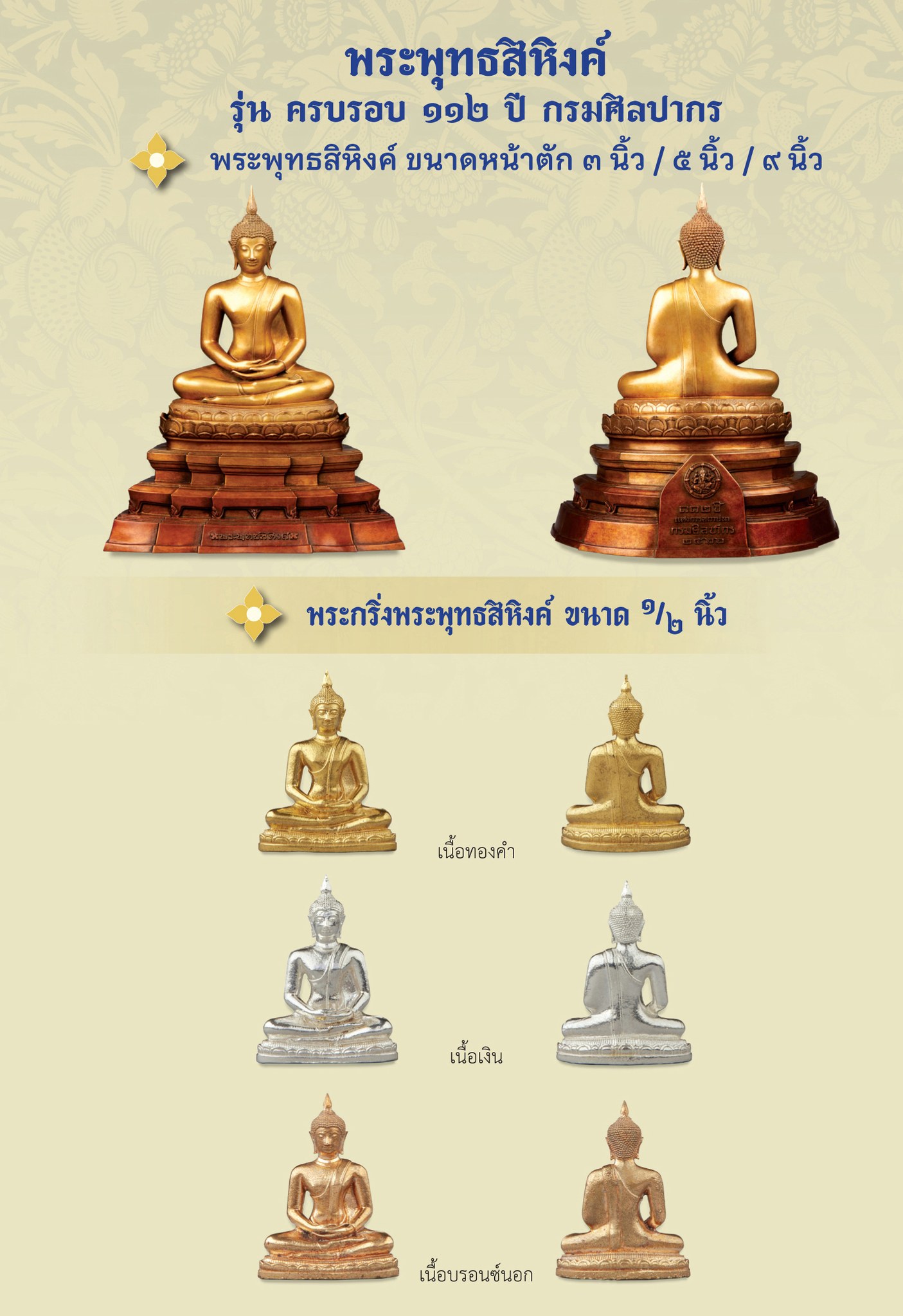 กรมศิลปากร จึงเชิญชวนพุทธศาสนิกชนและผู้สนใจสั่งจองพระพุทธสิหิงค์ พระกริ่งพระพุทธสิหิงค์ และเหรียญพระพุทธสิหิงค์ ได้ตั้งแต่บัดนี้เป็นต้นไป สอบถามรายละเอียดเพิ่มเติมได้ที่ ฝ่ายพัสดุ กลุ่มคลังและพัสดุ สำนักบริหารกลาง ชั้น ๓ อาคารกรมศิลปากร เทเวศร์ โทร. ๐ ๒๑๒๖ ๖๕๕๙ หรือ facebook page พระพิฆเนศวร ๑๐๘ ปี กรมศิลปากร (เปิดให้จองในวันจันทร์ -ศุกร์ เวลา ๐๙.๐๐ -๑๖.๐๐ น.) *ปิดวันเสาร์ - อาทิตย์ และวันหยุดนักขัตฤกษ์