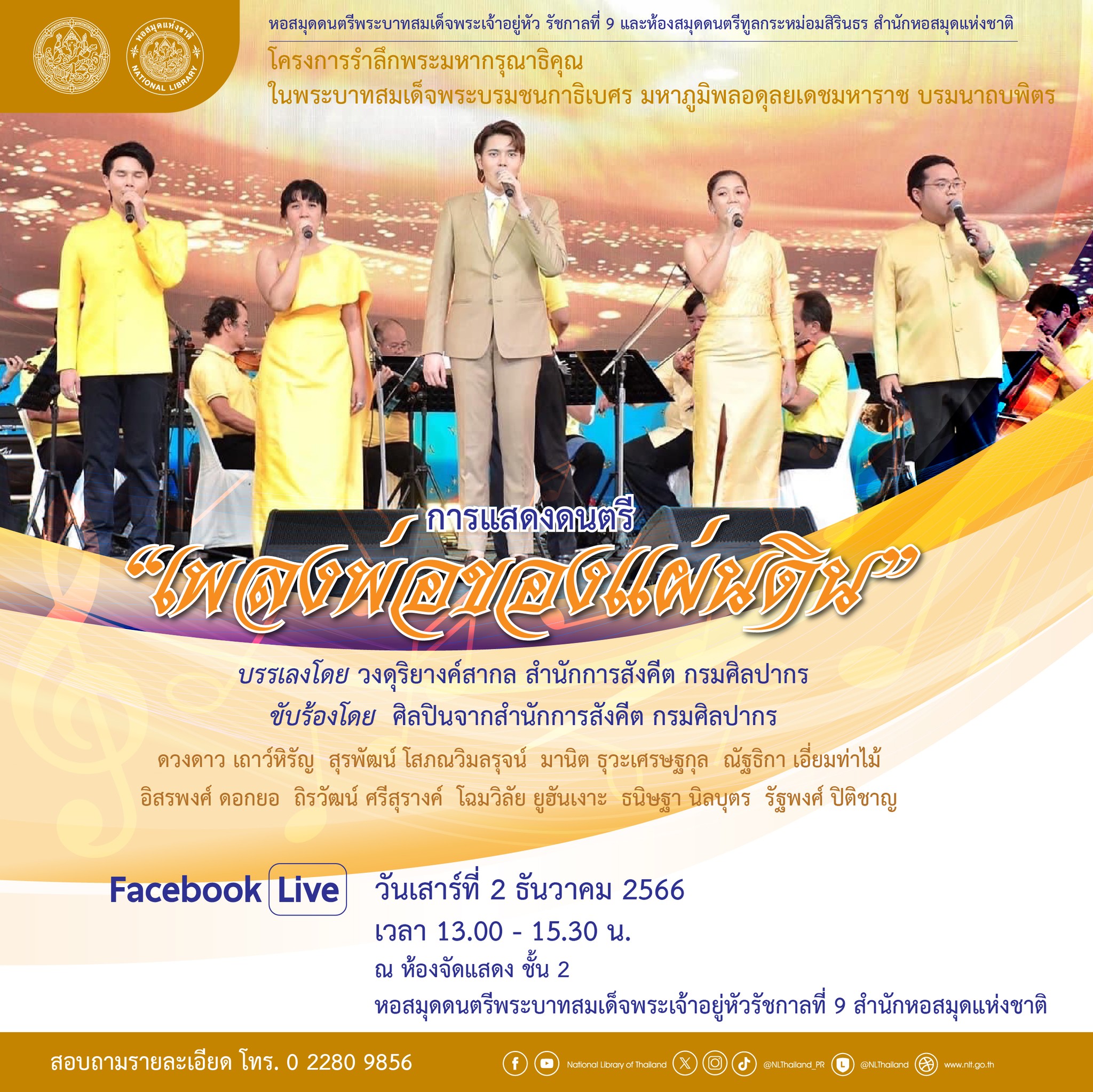 สำนักหอสมุดแห่งชาติ โดยหอสมุดดนตรีพระบาทสมเด็จพระเจ้าอยู่หัว รัชกาลที่ 9 และห้องสมุดดนตรีทูลกระหม่อมสิรินธร ขอเชิญชมการแสดงดนตรี "เพลงพ่อของแผ่นดิน" เพลงพระราชนิพนธ์ในพระบาทสมเด็จพระบรมชนกาธิเบศร มหาภูมิพลอดุลยเดชมหาราช บรมนาถบพิตร บรรเลงเพลงโดย วงดุริยางค์สากล สำนักการสังคีต กรมศิลปากร และขับร้องโดย ศิลปินจากสำนักการสังคีต กรมศิลปากร ซึ่งเป็นส่วนหนึ่งของโครงการรำลึกพระมหากรุณาธิคุณในพระบาทสมเด็จพระบรมชนกาธิเบศร มหาภูมิพลอดุลยเดชมหาราช บรมนาถบพิตร ในวันเสาร์ที่ 2 ธันวาคม 2566 เวลา 13.00-15.30 น. ณ ห้องจัดแสดง ชั้น 2 หอสมุดดนตรีพระบาทสมเด็จพระเจ้าอยู่หัวรัชกาลที่ 9 ภายในบริเวณหอสมุดแห่งชาติ เขตดุสิต กรุงเทพมหานคร