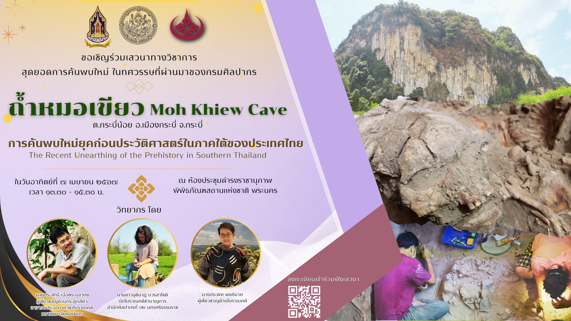 การเสวนาทางวิชาการ เนื่องในงานสัปดาห์วันอนุรักษ์มรดกไทย พุทธศักราช 2567 หัวข้อ "ถ้ำหมอเขียว การค้นพบใหม่ยุคก่อนประวัติศาสตร์ในภาคใต้ของประเทศไทย" ในวันอาทิตย์ที่ 7 เมษายน 2567 เวลา 13.30-15.30 น.