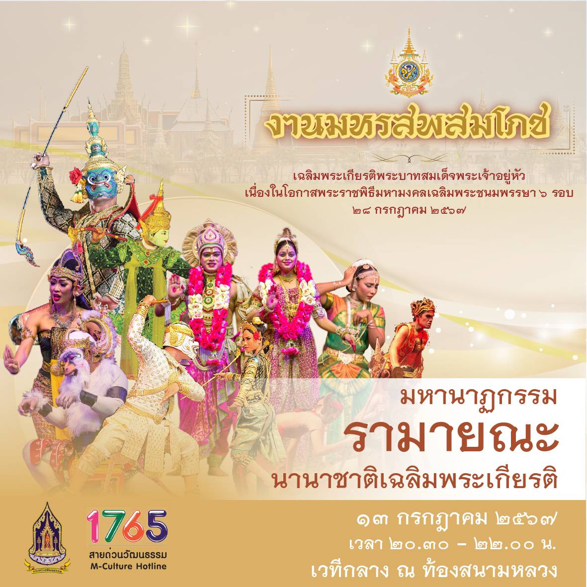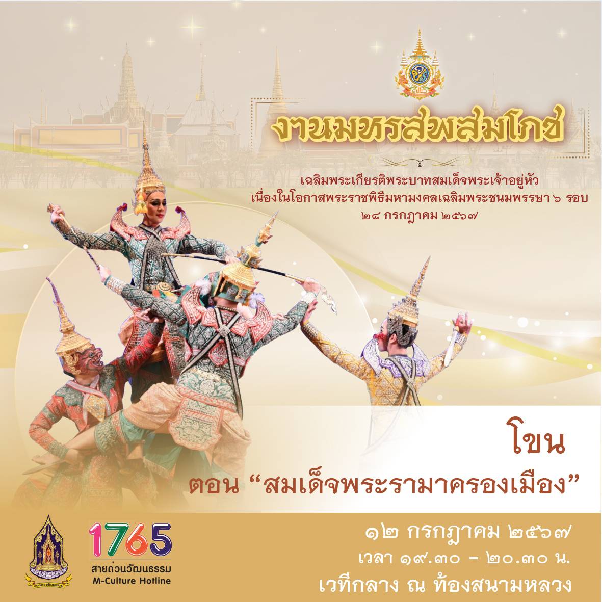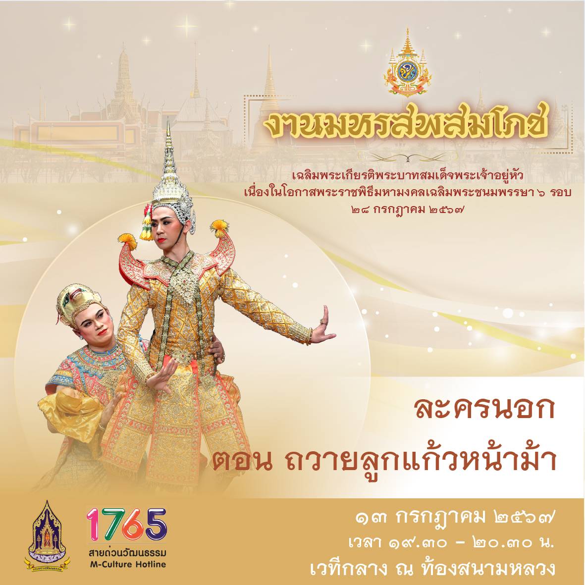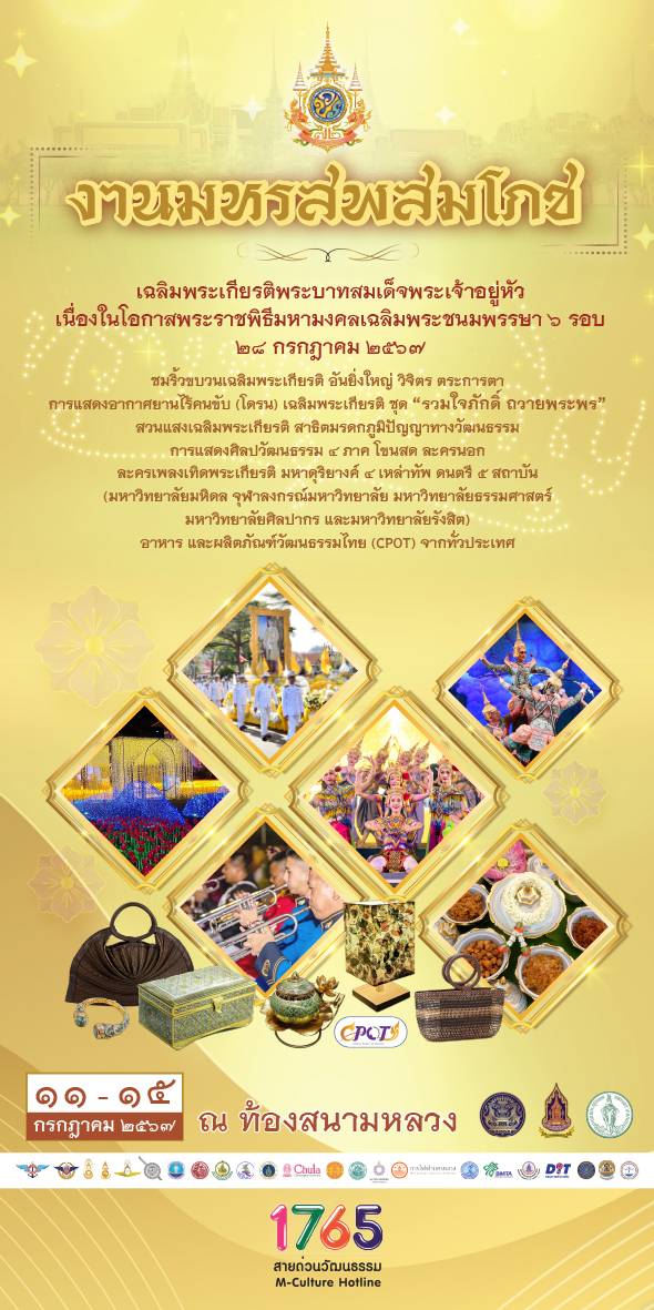 รัฐบาล โดยกระทรวงวัฒนธรรม ขอเชิญประชาชนร่วมงานมหรสพสมโภช เฉลิมพระเกียรติพระบาทสมเด็จพระเจ้าอยู่หัว เนื่องในโอกาสพระราชพิธีมหามงคล เฉลิมพระชนมพรรษา 6 รอบ 28 กรกฎาคม 2567 เชิญชมริ้วขบวนเฉลิมพระเกียรติ ชมความสวยงามของนิทรรศการสวนแสงเฉลิมพระเกียรติฯ การแสดงโดรนเฉลิมพระเกียรติฯ การแสดงโขนและการแสดงทางศิลปวัฒนธรรม การแสดงดนตรี มหาดุริยางค์สี่ ๔ เหล่าทัพ และดนตรี ๕ สถาบันการศึกษา การสาธิตมรดกภูมิปัญญาทางวัฒนธรรม ตลาดวัฒนธรรม สินค้าทางวัฒนธรรม (CPOT) และพบกับศิลปินดารามากมาย วันที่ ๑๑ - ๑๕ กรกฎาคม ๒๕๖๗ ณ ท้องสนามหลวง