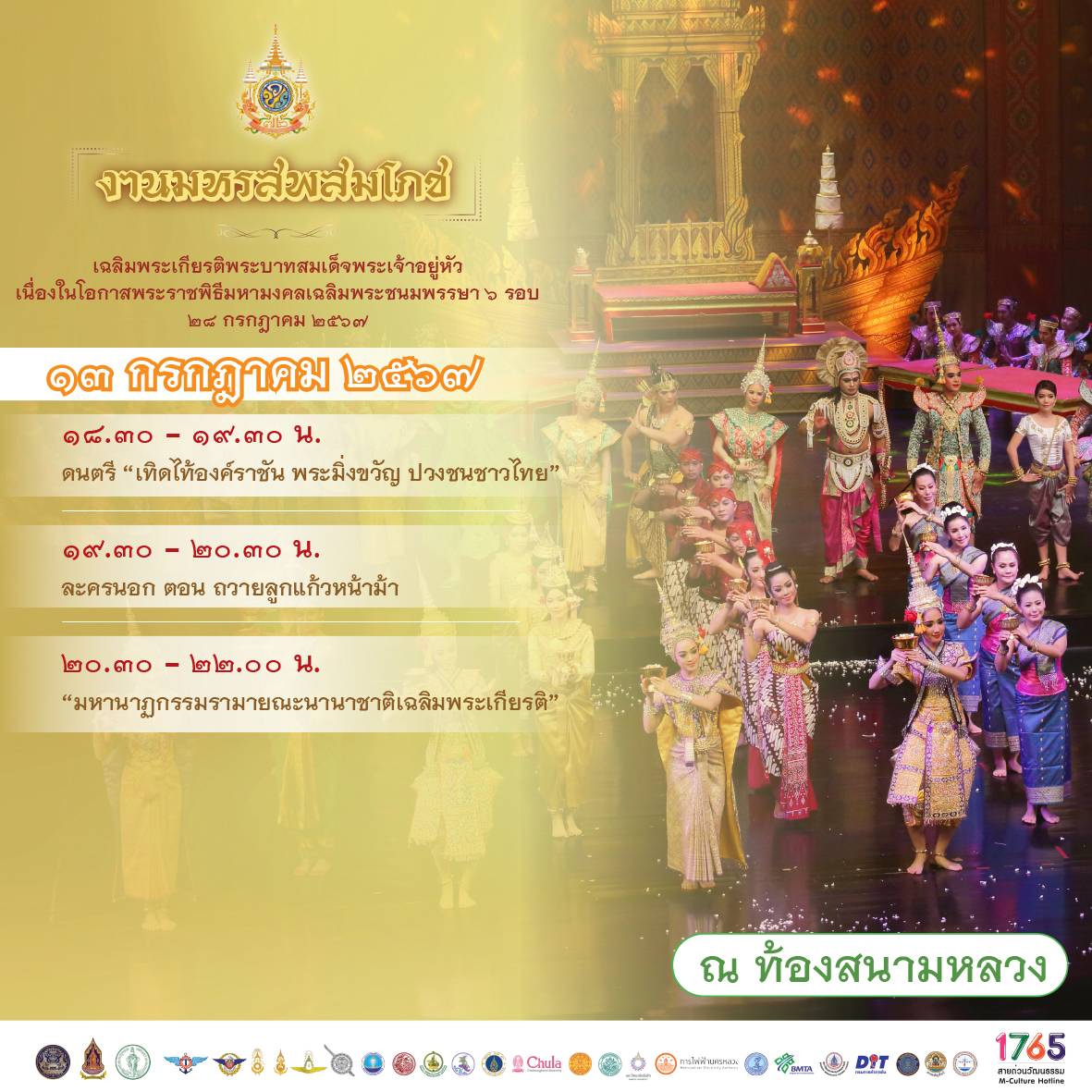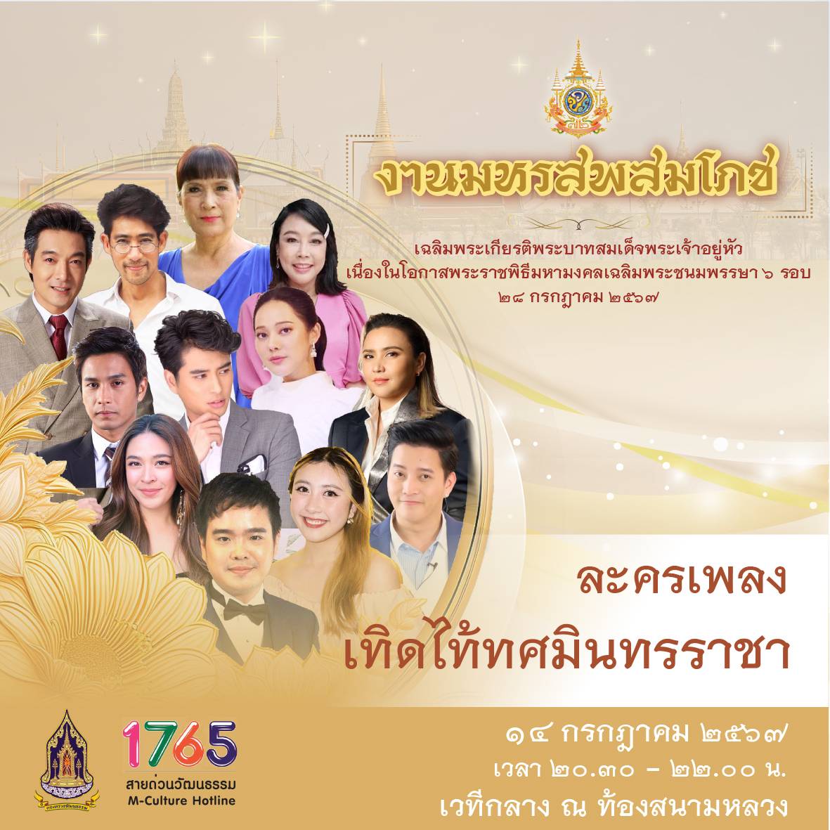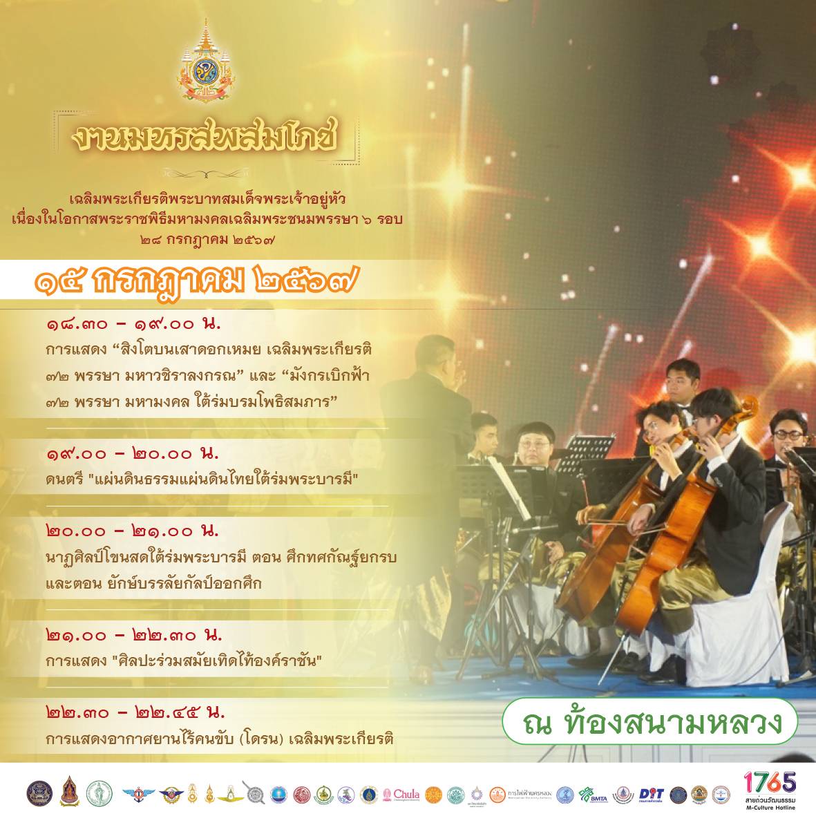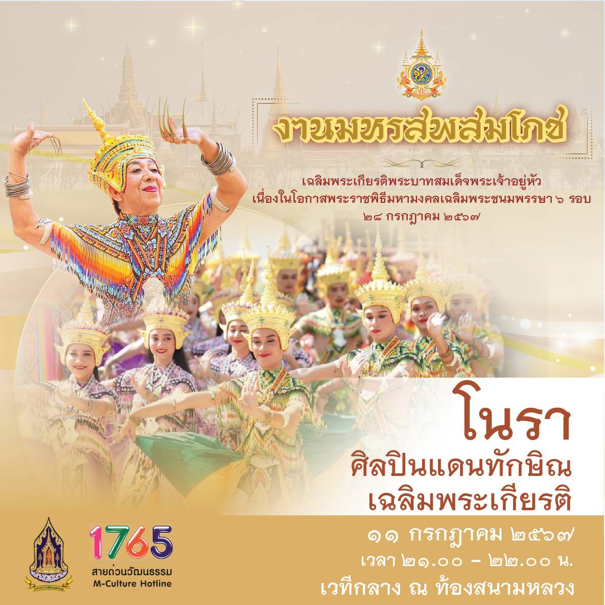 รัฐบาล โดยกระทรวงวัฒนธรรม ขอเชิญประชาชนร่วมงานมหรสพสมโภช เฉลิมพระเกียรติพระบาทสมเด็จพระเจ้าอยู่หัว เนื่องในโอกาสพระราชพิธีมหามงคล เฉลิมพระชนมพรรษา 6 รอบ 28 กรกฎาคม 2567 เชิญชมริ้วขบวนเฉลิมพระเกียรติ ชมความสวยงามของนิทรรศการสวนแสงเฉลิมพระเกียรติฯ การแสดงโดรนเฉลิมพระเกียรติฯ การแสดงโขนและการแสดงทางศิลปวัฒนธรรม การแสดงดนตรี มหาดุริยางค์สี่ ๔ เหล่าทัพ และดนตรี ๕ สถาบันการศึกษา การสาธิตมรดกภูมิปัญญาทางวัฒนธรรม ตลาดวัฒนธรรม สินค้าทางวัฒนธรรม (CPOT) และพบกับศิลปินดารามากมาย วันที่ ๑๑ - ๑๕ กรกฎาคม ๒๕๖๗ ณ ท้องสนามหลวง