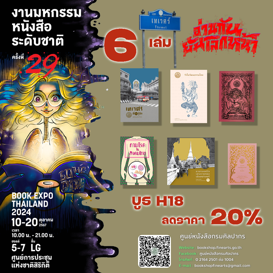 ศุนย์หนังสือกรมศิลปากร ออกร้านจำหน่ายหนังสือลดราคาสูงสุดถึง ๒๐% ในงานมหกรรมหนังสือระดับชาติ ครั้งที่ ๒๙ ระหว่างวันที่ ๑๐ – ๒๐ ตุลาคม ๒๕๖๗ ที่บูธ H๑๘ โซนหนังสือเก่า ฮอลล์ ๕ - ๗ ชั้น LG ศูนย์การประชุมแห่งชาติสิริกิติ์