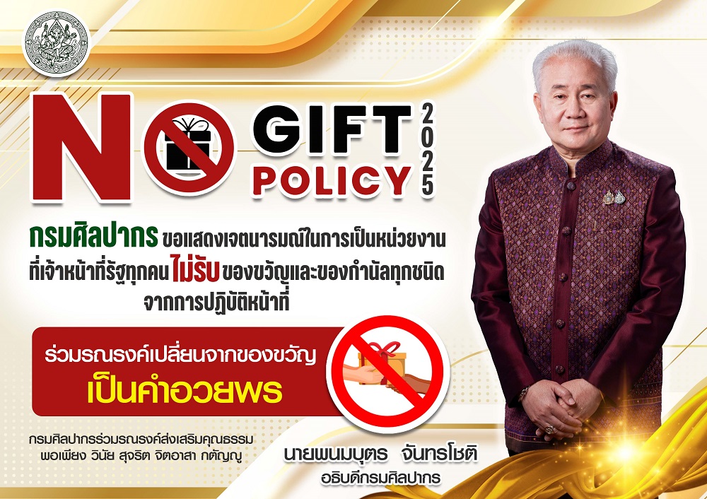 ประกาศกรมศิลปากร เรื่อง นโยบายไม่รับของขวัญและของกำนัลทุกชนิดจากการปฏิบัติหน้าที่ (No Gift Policy) ประจำปีงบประมาณ พ.ศ.๒๕๖๘