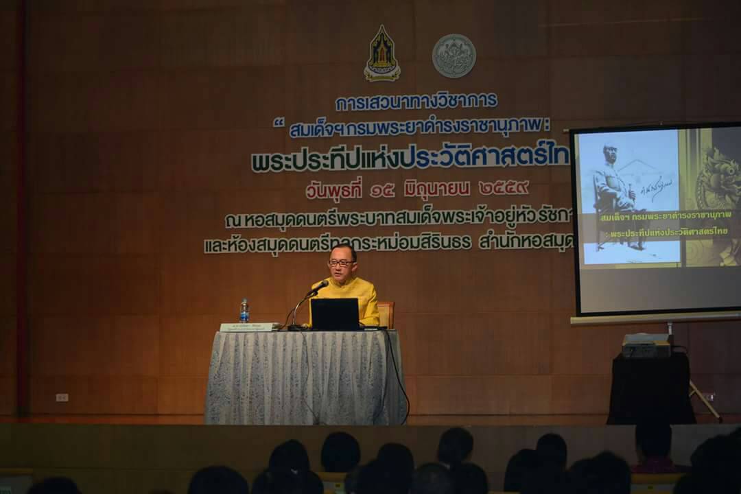 วันพุธที่ ๑๕ มิถุนายน ๒๕๕๙ เวลา ๐๙.๐๐ น. หม่อมหลวงปนัดดา ดิศกุล รัฐมนตรีประจำสำนักนายกรัฐมนตรี เป็นประธานเปิดการเสวนาทางวิชาการ เรื่อง “สมเด็จฯ กรมพระยาดำรงราชานุภาพ : พระประทีปแห่งประวัติศาสตร์ไทย” ณ ห้องประชุมหอสมุดดนตรีพระบาทสมเด็จพระเจ้าอยู่หัว รัชกาลที่ ๙ สำนักหอสมุดแห่งชาติ โดยมี นายกิตติพันธ์ พานสุวรรณ รองอธิบดีกรมศิลปากร เป็นผู้กล่าวรายงาน ทั้งนี้มีผู้สนใจเข้าร่วมฟังการเสวนาทั้งนักวิชาการ นักเรียน นักศึกษา ประชาชนทั่วไป ผู้บริหาร และเจ้าหน้าที่กรมศิลปากร กว่า ๒๙๐ คน