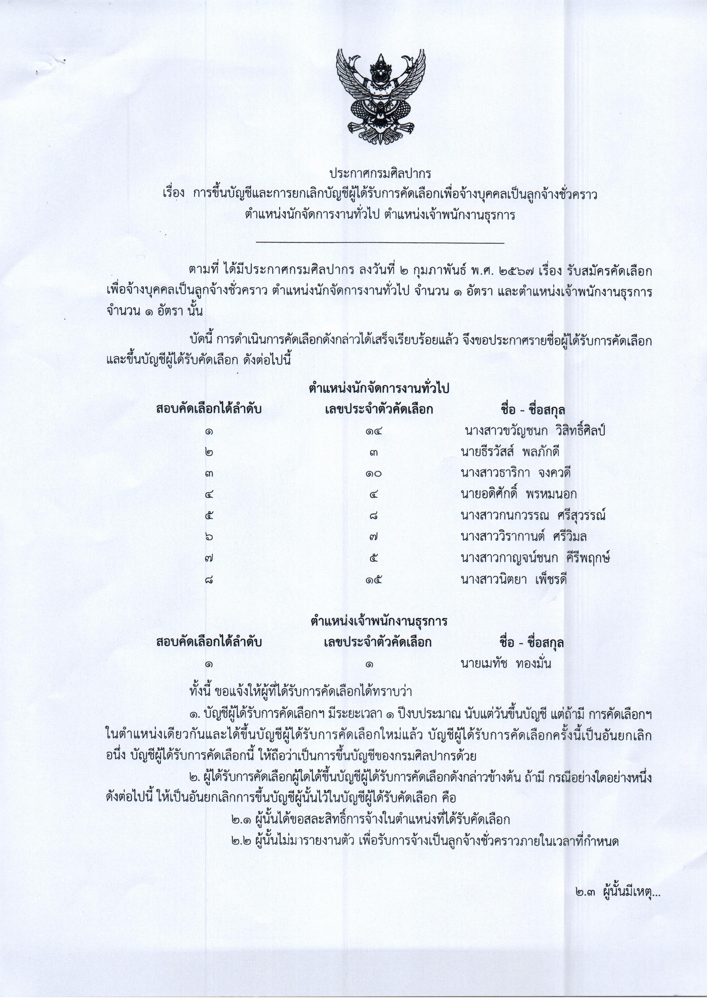 ประกาศการขึ้นบัญชีและการยกเลิกบัญชีผู้ได้รับการคัดเลือกเพื่อการจ้างบุคคลเป็นลูกจ้างชั่วคราว ตำแหน่งนักจัดการงานทั่วไป ตำแหน่งเจ้าพนักงานธุรการ