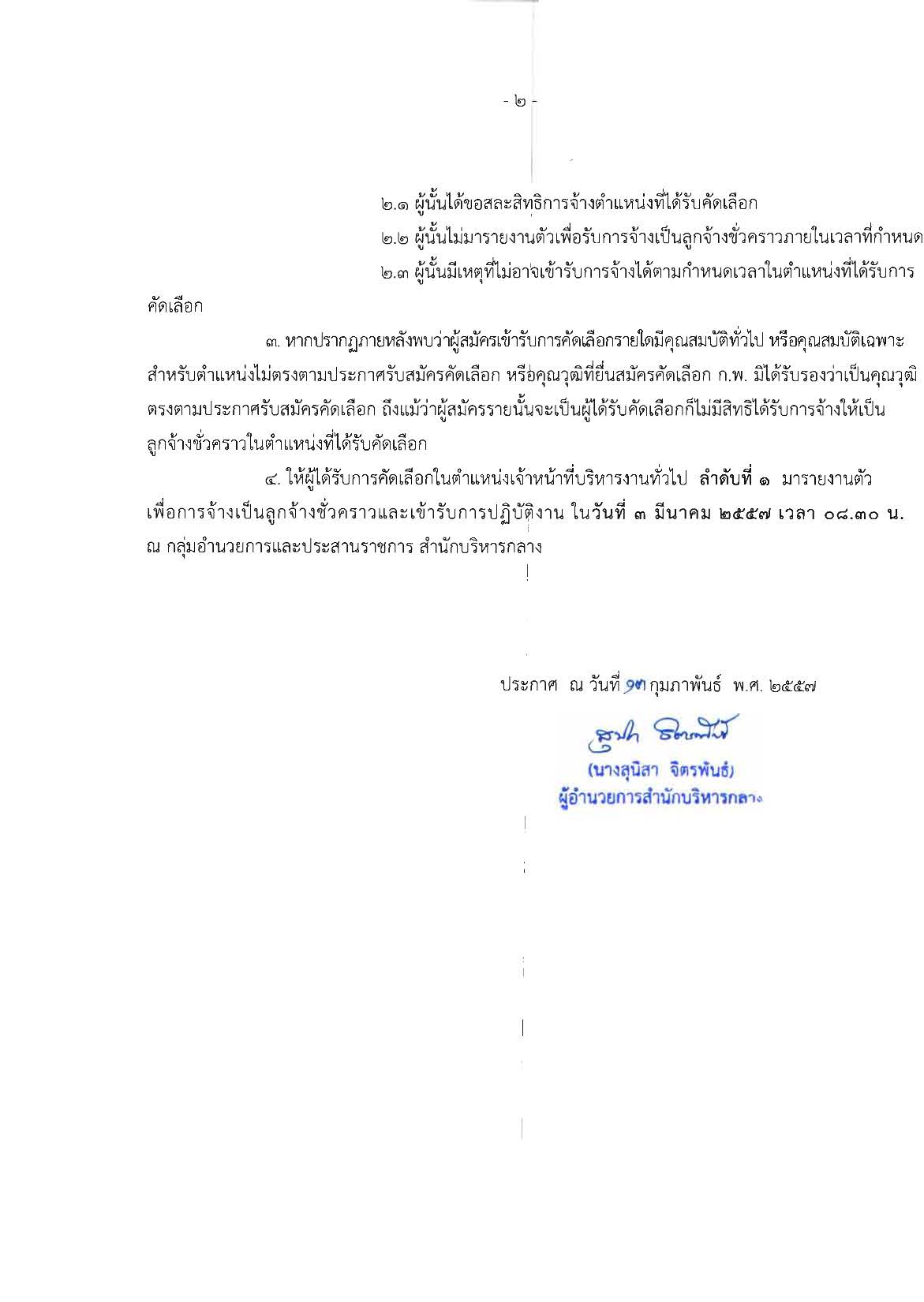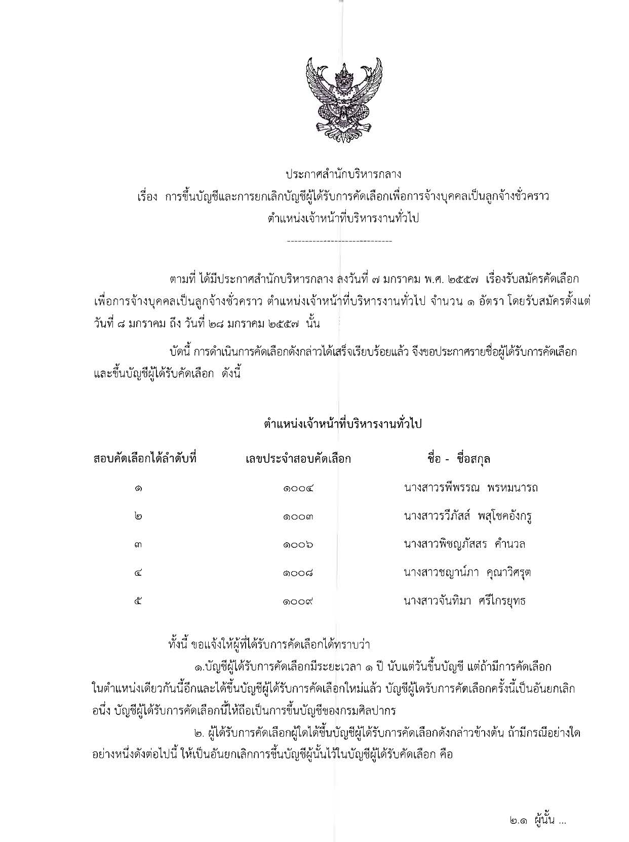 ประกาศการขึ้นบัญชีและการยกเลิกบัญชีผู้ได้รับการคัดเลือกเพื่อการจ้างบุคคลเป็นลูกจ้างชั่วคราว ตำแหน่งเจ้าหน้าที่บริหารงานทั่วไป
