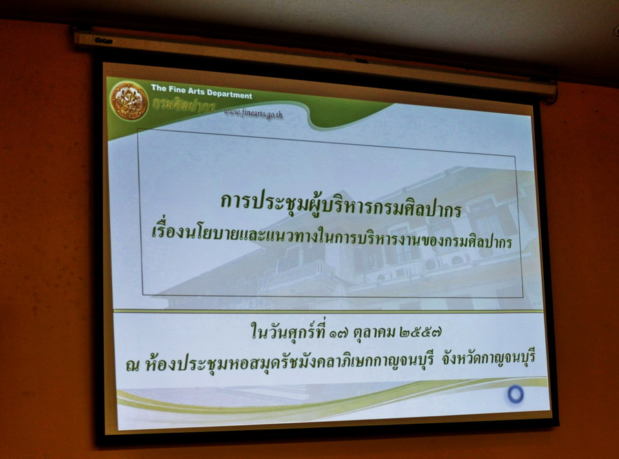 เมื่อวันศุกร์ที่ 17 ตุลาคม 2557 อธิบดีกรมศิลปากร และคณะผู้บริหารกรมศิลปากร ร่วมประชุม : เรื่องนโยบายและแนวทางในการบริหารงานของกรมศิลปากร ประจำปีงบประมาณ 2558 ณ ห้องประชุมหอสมุดแห่งชาติ รัชมังคลาภิเษกกาญจนบุรี