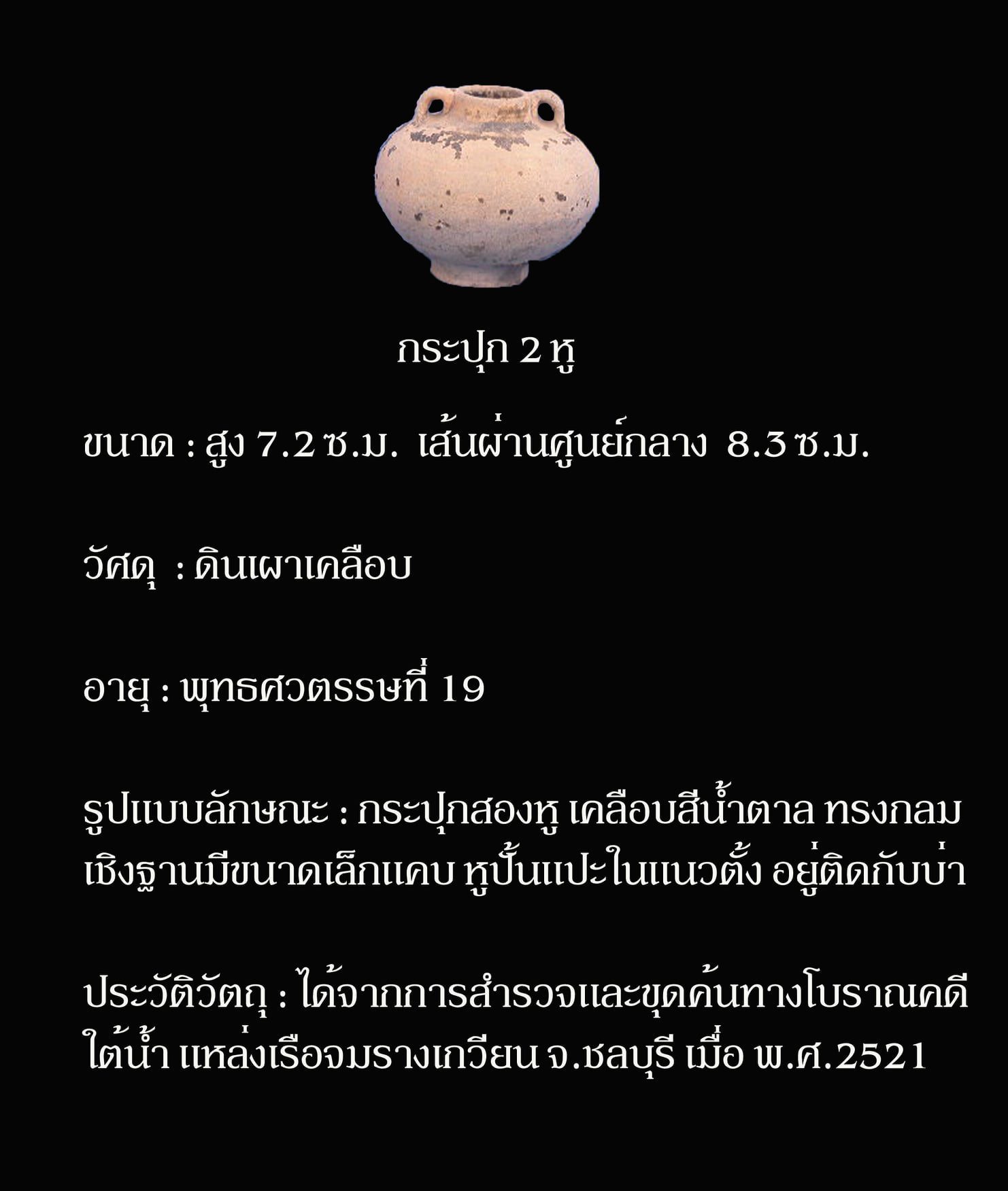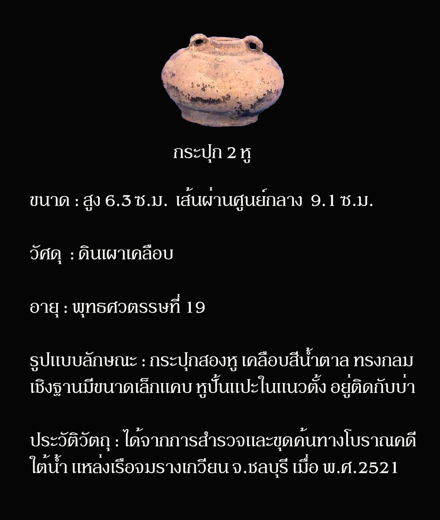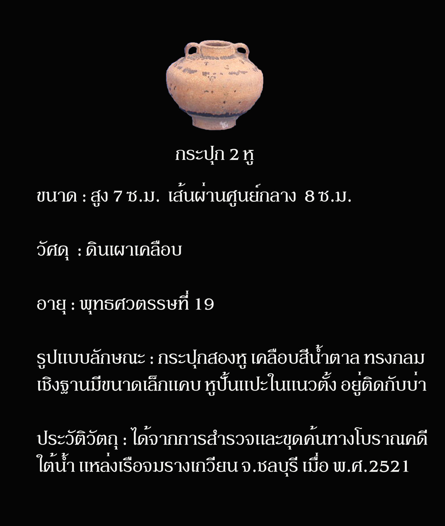 ในแหล่งโบราณคดีใต้น้ำพบในเรือรางเกวียนโดยพบร่วมกับเครื่องถ้วยเวียดนาม และเครื่องถ้วยจีนสมัยราชวงศ์หยวน