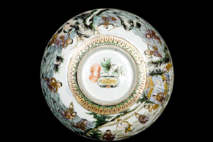 จานรูปหอยเป๋าฮื้อ เขียนสีลงยาบนเคลือบลายต้นพลัม ต้นสน และต้นไผ่