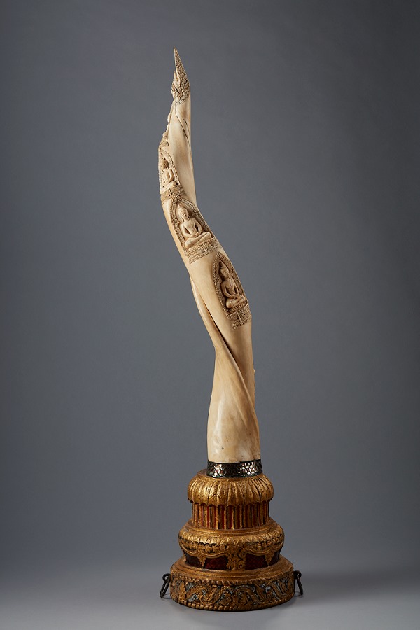พระพุทธรูปปางสมาธิในซุ้มเรือนแก้ว ๕ องค์ แกะสลักบนงาช้างที่บิดเป็นเกลียว ปลายงาแกะเป็นเศียรพญานาค คนไทยถือว่างาช้างที่งอกผิดจากรูปทรงปกติเป็นของขลังสูงค่านิยมนำมาแกะเป็นพระพุทธรูป โดยพระพุทธรูป ๕ พระองค์ หมายถึง พระพุทธเจ้าในกัลป์ปัจจุบัน ได้แก่ พระกกุสันธะ พระโกนาคม พระกัสสปะ พระโคตมะ และพระศรีอาริยเมตไตรย