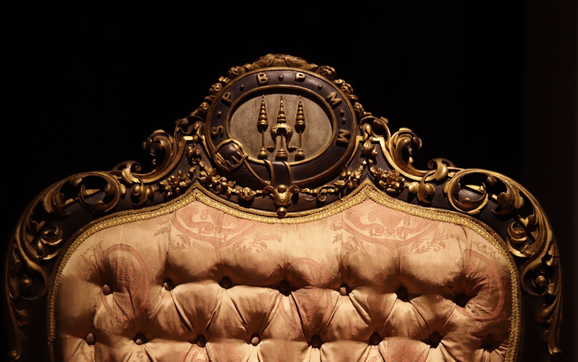 รายละเอียดของพระบรมราชสัญลักษณ์ รัชกาลที่ ๔ และพระปรมาภิไธยย่ออักษรโรมัน S.P.B.P.M.M. เหนือพนักพิงพระราชอาสน์