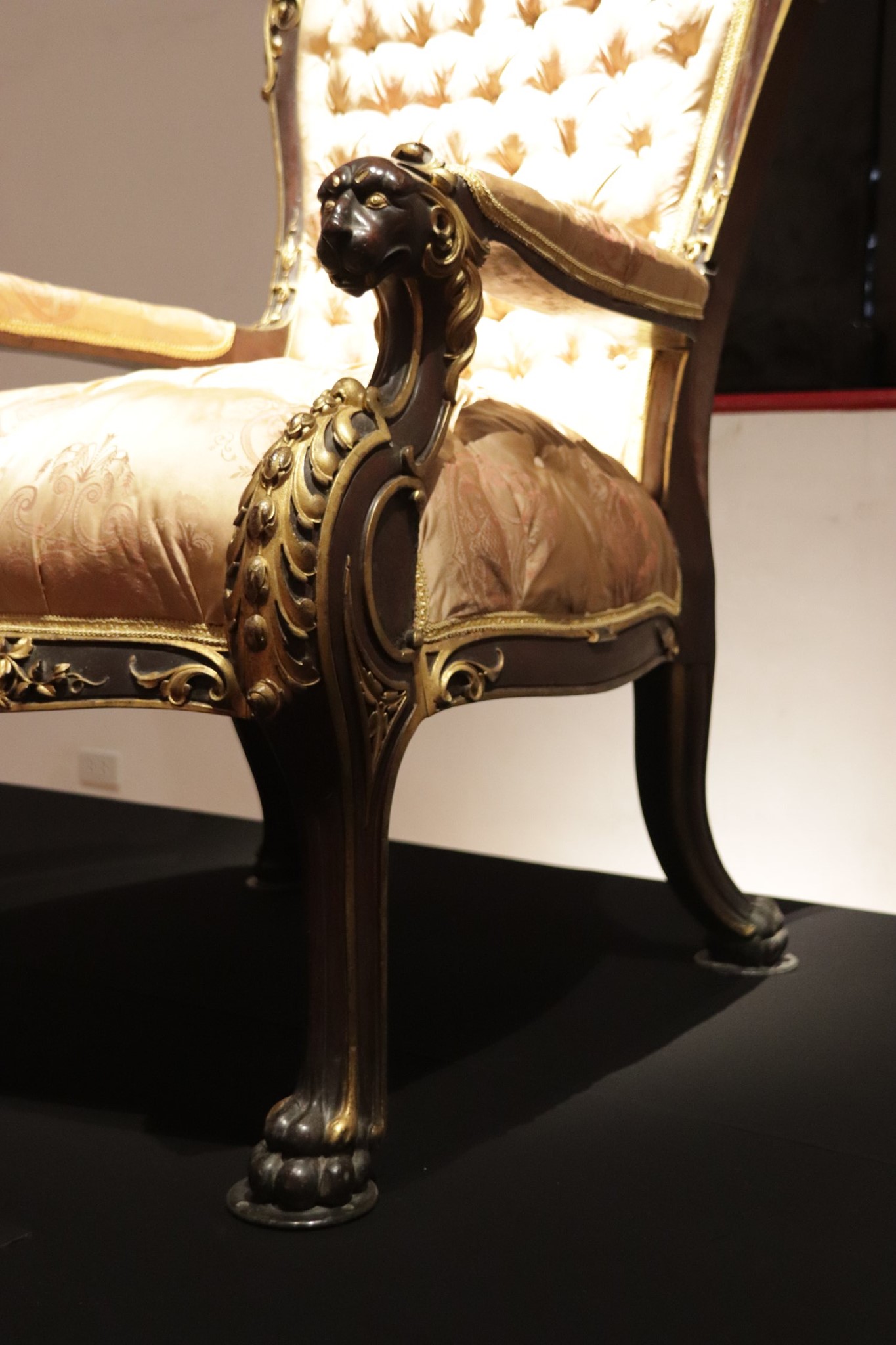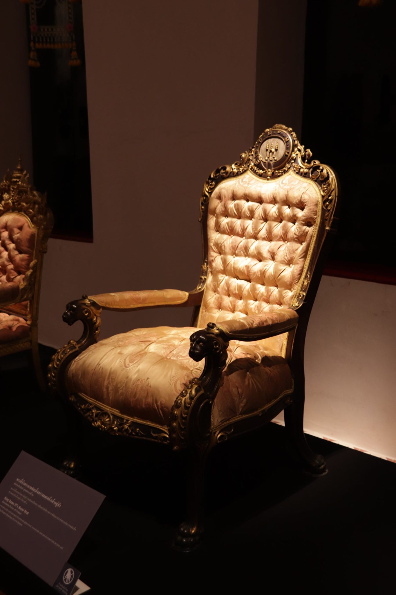 รายละเอียดของท้าวแขนและขาของพระราชอาสน์อย่างฝรั่งในรัชกาลที่ ๔ ซึ่งจำหลักเป็นรูปหัวสิงโต เท้าสิงโต ปัจจุบันจัดแสดงในพระที่นั่งวายุสถานอมเรศ ห้องเครื่องสูง พระแท่นราชบัลลังก์ และพระโธรน พิพิธภัณฑสถานแห่งชาติ พระนคร