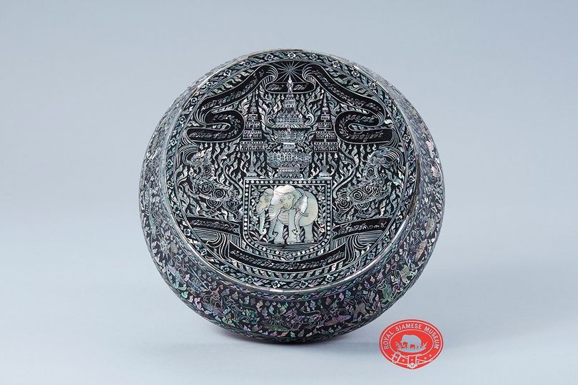 ฝาบาตรประดับมุกเป็นลวดลายตราแผ่นดินรูปช้างสามเศียรหรือช้างไอยราพตอยู่ภายในโล่ ภายใต้พานพระมหากฐินประดิษฐานพระจุลมงกุฎ (พระเกี้ยว) ขนาบด้วยฉัตรเครื่องสูง ด้านซ้ายโล่ประดับรูปราชสีห์ส่วนด้านขวาเป็นคชสีห์ ตอนบนและล่างตราแผ่นดินมีแถบแพรจารึกพระปรมาภิไธยและการพระราชพิธีบรมราชาภิเษก