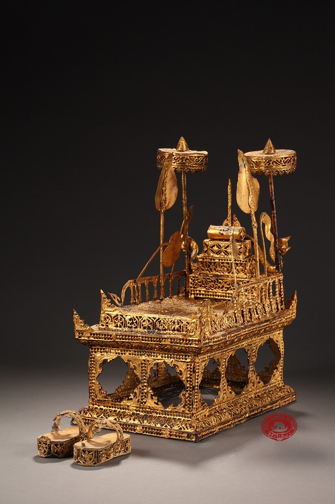 บัลลังก์จำลอง หรือ อาสนา หรือ ราชอาสน์ พร้อมเครื่องสูงสำหรับกษัตริย์ เป็นเครื่องสักการบูชาพระพุทธเจ้า ประกอบด้วย บัลลังก์หรือพระแท่นบรรทม ฉัตร แส้ บังสูรย์ พัดใบตาล เบื้องหัวนอนมีแท่นสี่เหลี่ยมซ้อนกันชั้นบนสุดเป็นพระเขนย (หมอน) กลางเบื้อหัวนอนเคยมีวัตถุปลายแหลมแต่หักชำรุด อาจได้แก่พระขรรค์ นอกจากนี้ยังมีฉลองพระบาท (รองเท้า) อีก ๑ คู่ พระเขนยนี้สันนิษฐานว่าคงแทนอุณหิส (กรอบหน้า) ซึ่งเป็นของสูงคู่กับพระเศียร สิ่งเหล่านี้คือเครื่องราชกกุธภัณฑ์ สิ่งที่แสดงความเป็นพระราชาธิบดี