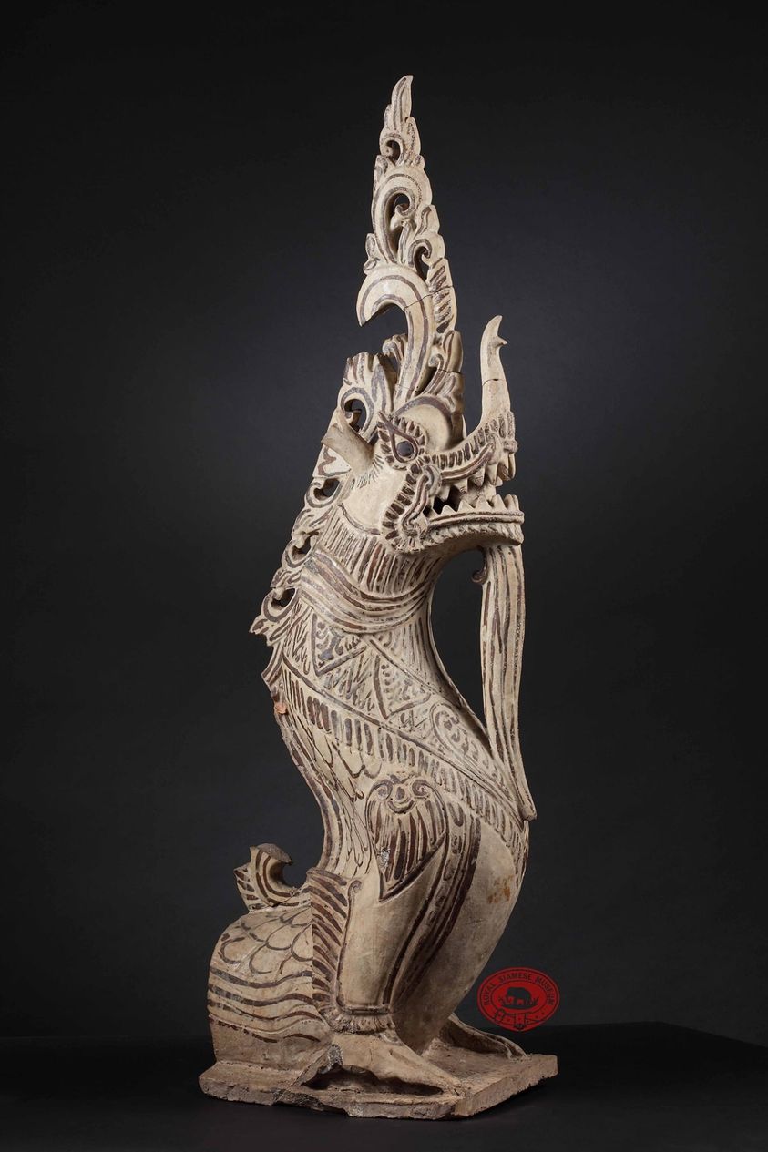 มกร เป็นสัตว์น้ำในเทวตำนานของศาสนาฮินดู ส่วนบนมีหัวและลำตัวเหมือนสัตว์บก ส่วนล่างมีหางเหมือนปลา รูปมกรชิ้นนี้มีศีรษะและลำตัวคล้ายสิงห์ คือ มีแผงรอบคอ มีขา และงวงคล้ายช้าง มีเขาคล้ายกวาง ตกแต่งส่วนหัวเป็นตัวกระหนก ไม่มีส่วนลำตัว แต่มีช่องกว้างที่ส่วนล่างเพื่อให้ประกอบเข้ากับราวพนักบันได