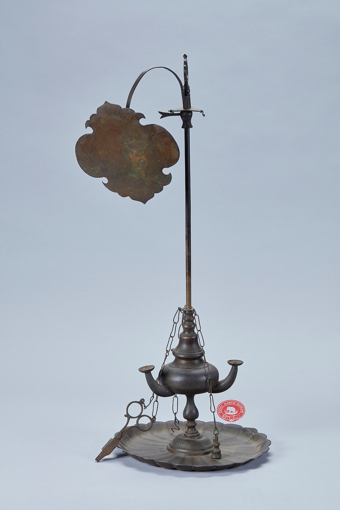 ชวาลา ๓ ไส้ ทำด้วยโลหะ ใช้งานโดยตั้งพื้นหรือแขวน ฐานเป็นจานรับขี้ไส้ มีหม้อก้นมนสำหรับใส่น้ำมัน และมีพวยสำหรับสอดไส้ติด ๓ พวย ปากหม้อทำฝาครอบเป็นจอมสูงขึ้นไป ตอนบนมีแป้นโลหะรูปสามเหลี่ยม ปลายสุดของแป้นแต่ละมุมเจาะรู สำหรับร้อยสายโซ่ยาว สายหนึ่งห้อยคีมคีบไส้ สายหนึ่งแขวนเหล็กเขี่ยไส้ และสายหนึ่งแขวนฝาสำหรับใช้ครอบดับดวงไฟ เหนือแป้นสามเหลี่ยมติดก้านโค้งปลายติดแผ่นโลหะรูปใบโพธิ์ ใช้บังลมพัดเปลวไฟ