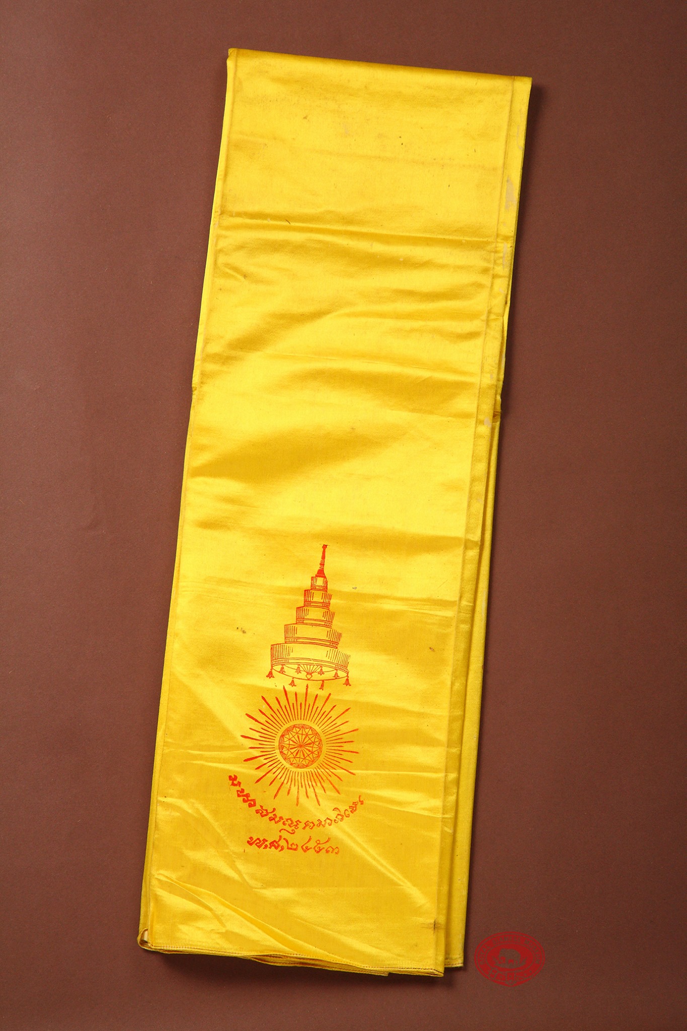 ผ้าแพรพื้นเหลือง พิมม์สีแดงตราเพชรลูกเปล่งรัศมีภายใต้เศวตฉัตร ๕ ชั้น ภายใต้มีข้อความ “มหาสมณุตมาภิเษก พ,ศ,๒๔๕๓” ปรากฏตามลายพระหัตถ์สมเด็จพระมหาสมณเจ้า กรมพระยาวชิรญาณวโรรส ทูลพระเจ้าบรมวงศ์เธอ กรมหลวงสรรพศาสตรศุภกิจ ลงวันที่ ๑๕ พฤศจิกายน ร.ศ. ๑๒๙ (พ.ศ. ๒๔๕๓) ความตอนหนึ่งว่า