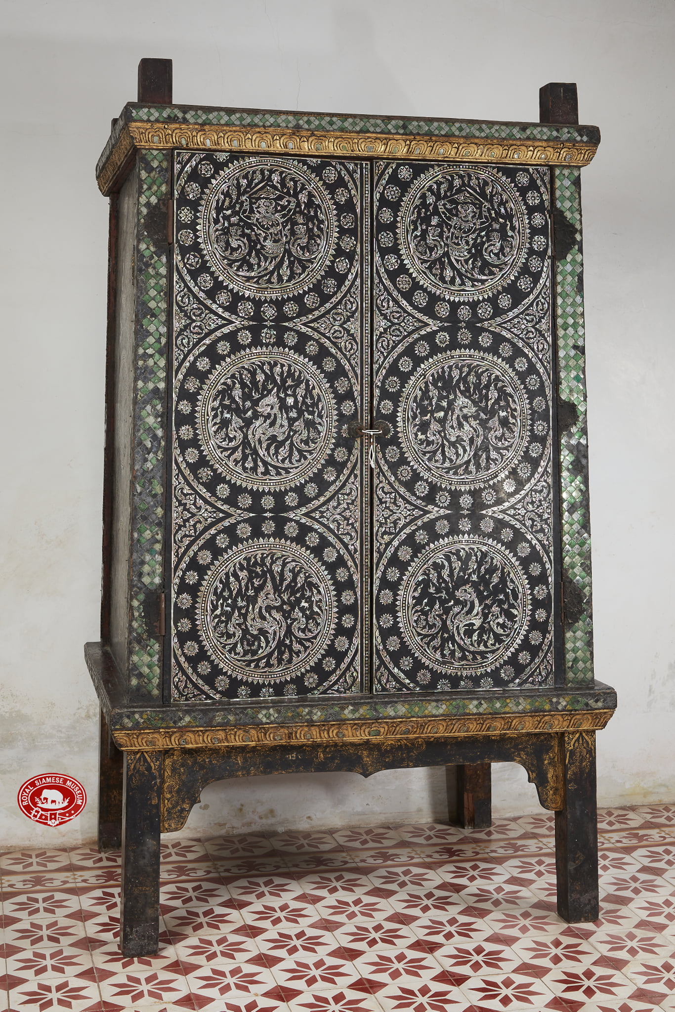 ตู้พระธรรมขาหมูลงรักประดับมุก ศิลปะอยุธยา พุทธศตวรรษที่ ๒๓ จัดแสดงอยู่ที่ มุขหน้าพระที่นั่งพรหมเมศธาดา ในหมู่พระวิมาน พิพิธภัณฑสถานแห่งชาติ พระนคร ฝาตู้ด้านซ้ายมีงานประดับมุกรูปเหรา
