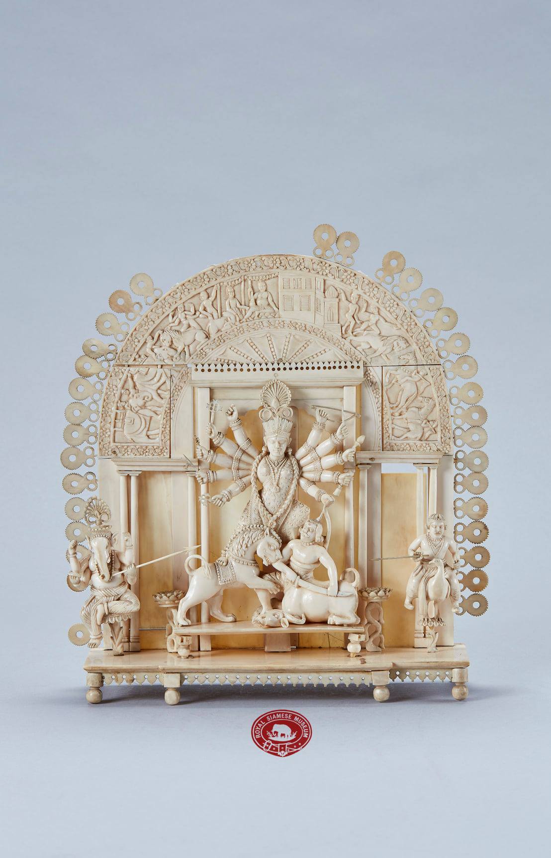 งาช้างจำหลักรูปพระนางทุรคาสิบกรในอิริยาบถทรงยืนบนสิงห์กำลังปราบมหิษาสูรอยู่ภายในอาคาร พระกรซ้ายล่างจับผมของมหิษาสูร ส่วนพระกรที่เหลือทรงอาวุธต่าง ๆ กรอบวงโค้งด้านบนจำหลักภาพบุคคลขี่สัตว์กำลังต่อสู้กันและอาคารประดับยอดโดม ด้านซ้ายจำหลักรูปพระคเณศสี่กรประทับนั่งห้อยพระบาท พระศอทรงสร้อยลูกประคำ พระกรทั้งสี่ทรงทองพระกร นุ่งผ้าโธตียาวจรดพระบาท ข้อพระบาททรงทองพระบาท ด้านขวาจำหลักรูปสกันทกุมารสองกร (หรือขันทกุมาร) ประทับเหนือนกยูง พระศอทรงสร้อยลูกประคำ นุ่งผ้าโธตียาว ทรงรองพระบาท
