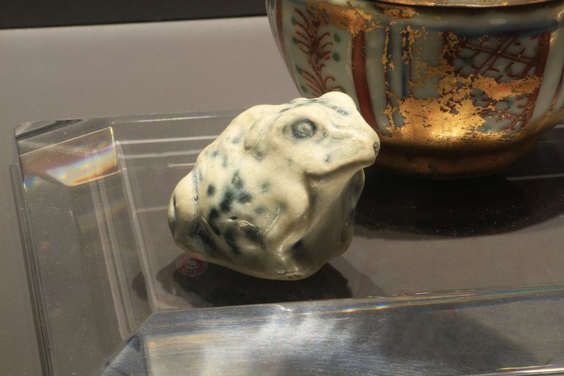 กบดินเผาเคลือบ ตัดเส้นสีครามบนพื้นขาว ภายในกลวงเจาะรูวงกลมบริเวณปากและกลางสันหลัง สันนิษฐานว่าใช้ใส่น้ำสำหรับฝนหมึกจีน ตามประวัติซึ่งนายมานิต วัลลิโภดม (ขณะเป็นภัณฑารักษ์พิเศษ กองโบราณคดี กรมศิลปากร) ว่าได้มาจากวัดปางไม้ และกำหนดอายุสมัยว่าเป็นงานศิลปกรรมจีน ราชวงศ์หมิงตอนปลาย
