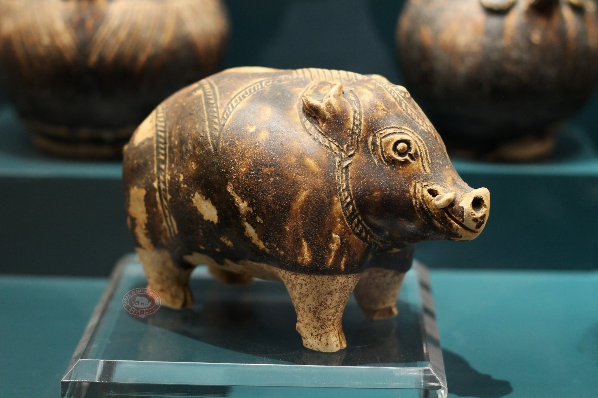 ภาชนะดินเผาเคลือบสีน้ำตาล รูปหมูป่ายืน ลักษณะลำตัวอ้วน หูสั้น จมูกยื่น ที่มุมปากมีเขี้ยวขนาดเล็ก ปรากฏร่องรอยการทาน้ำเคลือบสีน้ำตาล (brown-glazed) เฉพาะส่วนใบหน้ากับลำตัว บริเวณส่วนคอและลำตัวตกแต่งด้วยลายขูดขีดคล้ายลายเชือกทาบ ส่วนหลังหมูป่าเจาะเป็นช่องสำหรับบรรจุของไว้ภายใน สันนิษฐานว่าใช้สำหรับบรรจุปูนขาว
