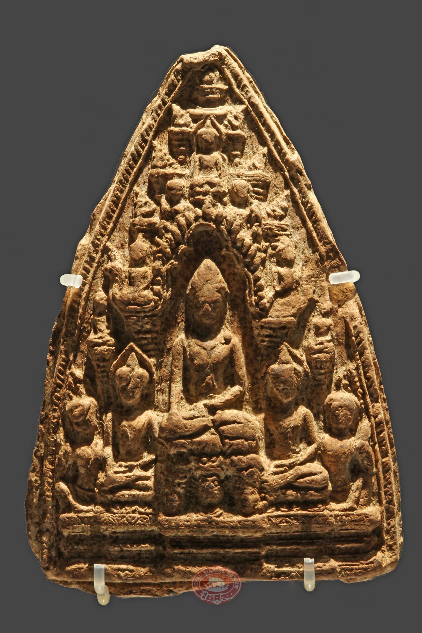 พระพิมพ์กรอบสามเหลี่ยม กึ่งกลางเป็นพระพุทธรูปทรงเครื่องอาภรณ์อย่างกษัตริย์ ประทับขัดสมาธิเพชรบนฐานบัว แสดงปางมารวิชัย ขนาบข้างด้วยพระพุทธรูปปางมารวิชัย ประทับขัดสมาธิเพชรบนฐานบัว พระเศียรแสดงประภามณฑล มีรูปบุคคลนั่งอยู่ด้านข้าง ทั้งหมดนี้ประดิษฐานอยู่บนฐานปัทม์ยกเก็จภายใต้ปราสาท ส่วนเรือนชั้นซ้อนแต่ละชั้นประดิษฐานพระพุทธรูปปางมารวิชัย ประทับขัดสมาธิเพชร ด้านบนสุดประดับยอดดอกบัวตูม กรอบซุ้มของพระประธานมีลักษณะหยักโค้งประดับใบระกา ส่วนปลายซุ้มทำเป็นเศียรนาค ด้านข้างปราสาทประดับก้านดอกบัวทั้งสองข้างรองรับพระพุทธรูปปางมารวิชัย ขัดสมาธิเพชร