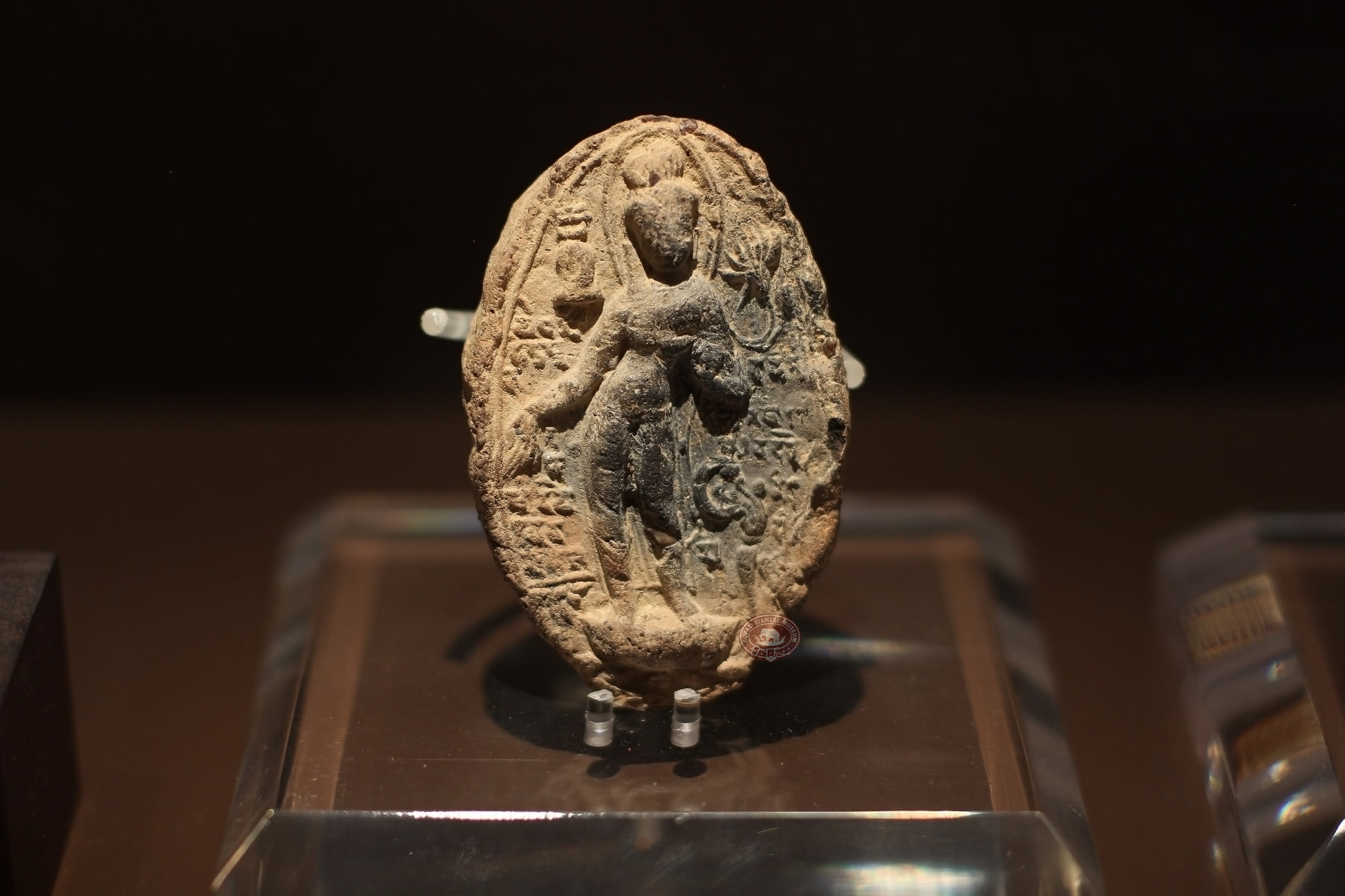 ดินเผากลมรูปพระโพธิสัตว์ทรงยืนตริภังค์* แสดงวรทมุทรา (ปางประทานพร) พระเกศารวบขึ้นเป็นพระเมาลี รอบพระเศียรแสดงศิรประภา หรือรัศมี (สื่อถึงเป็นผู้มีพระธรรมเป็นแสงสว่าง) พระพรหาขวาแนบพระวรกาย ยกพระกรหันฝ่าพระหัตถ์ขวาออก พระหัตถ์ซ้ายทรงก้านดอกบัวอุตปละ (utpala) หรือ บัวสาย พระวรกายท่อนล่างแสดงการทรงพระภูษายาวจรดข้อพระบาท ด้านข้างของพระโพธิ์สัตว์มีจารึกอักษรเทวนาครี และสถูป