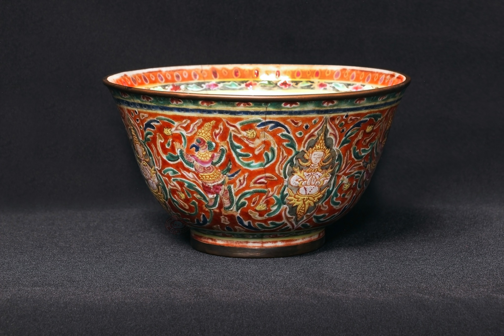 ชามเบญจรงค์ ก้นลึก ด้านนอกชามเขียนลายเทพพนมและครุฑคั่นด้วยลายก้านขดบนพื้นสีแดง ลายเทพนมลักษณะเป็นเทวดาครึ่งองค์ แสดงการทรงเครื่อง สวมมงกุฎยอดแหลม มีกรรเจียกจร กรองศอ สร้อยสังวาลและทองกร ท่อนล่างเป็นช่อดอกไม้ ส่วนครุฑทำท่าสยายปีก สวมเครื่องประดับ ปากชามผายเขียนลายดอกไม้สีชมพูบนพื้นสีเขียว ขอบปากชามเลี่ยมทองเหลือง ตัวชามสอบลง ขอบก้นชามเลี่ยมทองเหลืองเช่นกัน