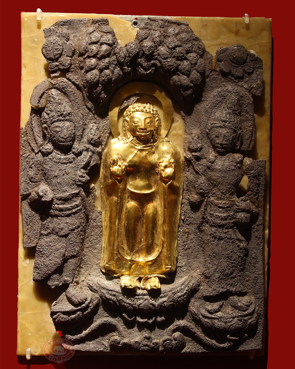 แผ่นโลหะสัมฤทธิ์และทองคำดุนรูปพระพุทธรูปยืนแสดงวิตรรกมุทรา (ปางแสดงธรรม) สองพระหัตถ์ ขนาบข้างด้วยบริวาร พระพุทธรูปมีพุทธลักษณะทรงยืนสมภังค์ (ยืนตรง) พระเศียรมีเม็ดพระศกมีขนาดใหญ่ พระขนงต่อกันเป็นปีกกา พระเนตรเปิด พระนาสิกใหญ่แบะออก และพระโอษฐ์แย้มพระสรวล รอบพระเศียรมีวงโค้งแทนความหมายถึงศิรประภา* พระวรกายครองจีวรห่มคลุม ชายจีวรด้านหน้าตกลงมาเป็นวงโค้งรูปอักษรโรมันตัวยู (U) ทรงยืนอยู่เหนือฐานบัว ใต้ต้นโพธิพฤกษ์ ขนาบข้างด้วยพระอาทิตย์-พระจันทร์
