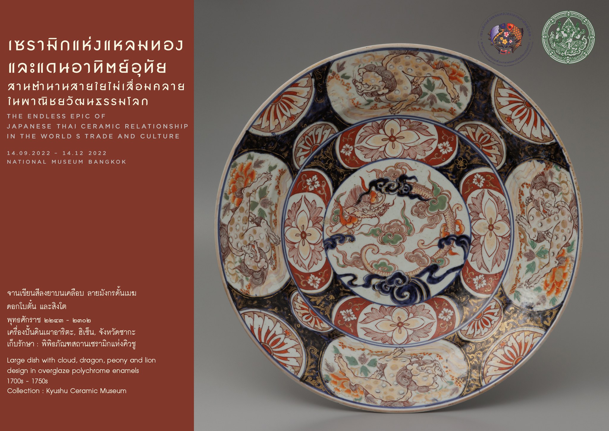 จานเขียนสีลงยาบนเคลือบ ลายมังกรตั้นเมฆ ดอกโบตั๋นและสิงโต