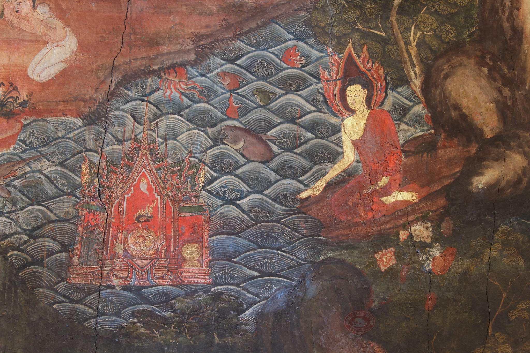 จิตรกรรมสีฝุ่นภาพพระโพธิ์สัตว์ประทับริมฝั่งแม่น้ำ ลอยถาดไปยังวิมานของนาคนามว่าพญากาฬ ซึ่งขดตัวอยู่ในปราสาทและเบื้องหน้ามีพานรองรับถาดของอดีตพุทธเจ้า