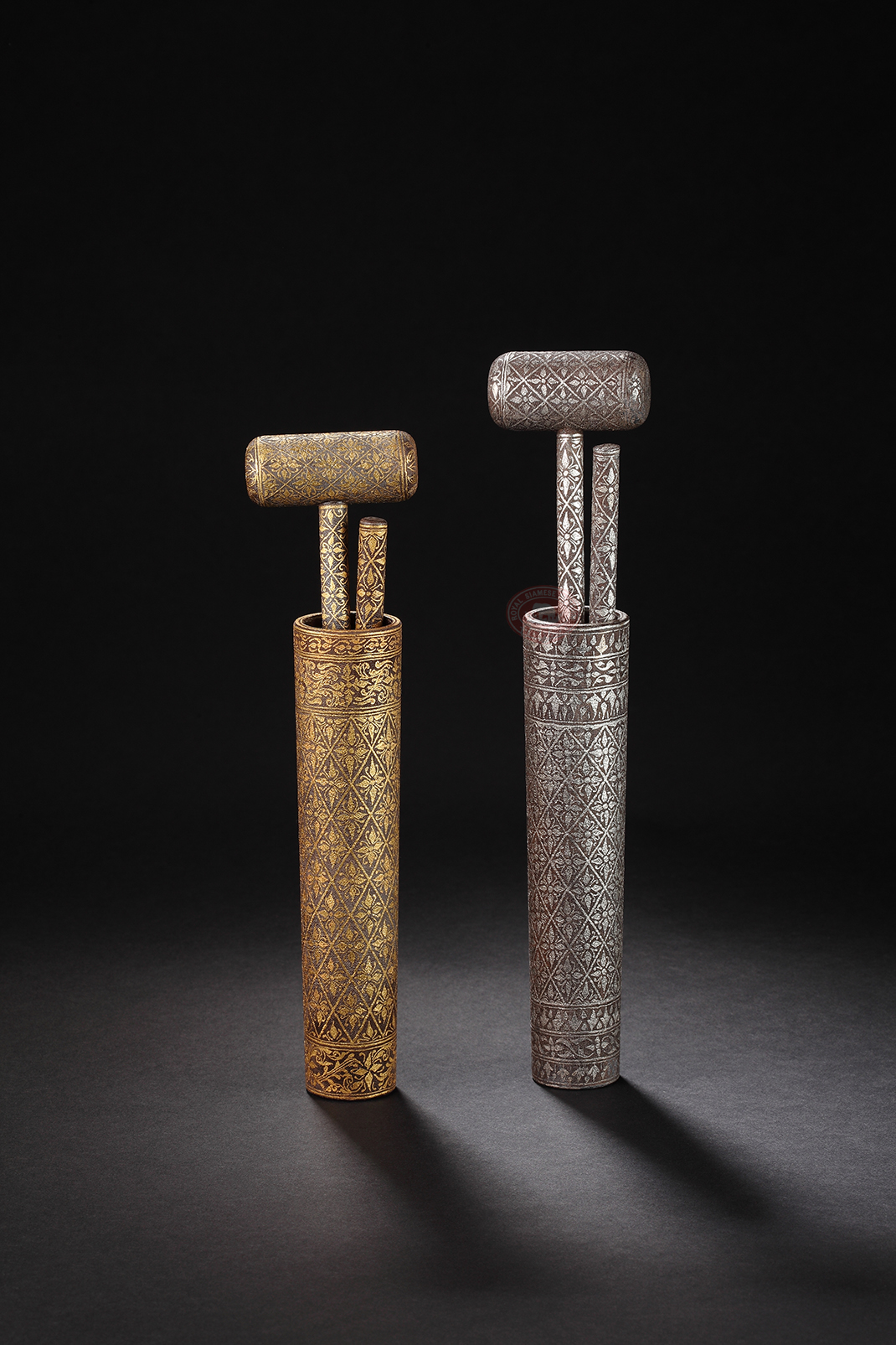 ตะบันหมากคู่นี้ทำจากเหล็ก ตกแต่งด้วยกรรมวิธีคร่ำเงิน และคร่ำทอง ลำตัวกระบอกตะบันหมากคร่ำลายราชวัตรดอกลอย ปากกระบอกและก้นกระบอกประดับแถบลายเกลียวดอกสี่กลีบ ลูกตะบันมีด้ามเป็นรูปทรงกระบอก ประดับลายราชวัตรดอกลอย และสากมีเป็นลักษณะแท่งเหล็กกลมยาวประดับลายราชวัตรดอกลอยเช่นกัน