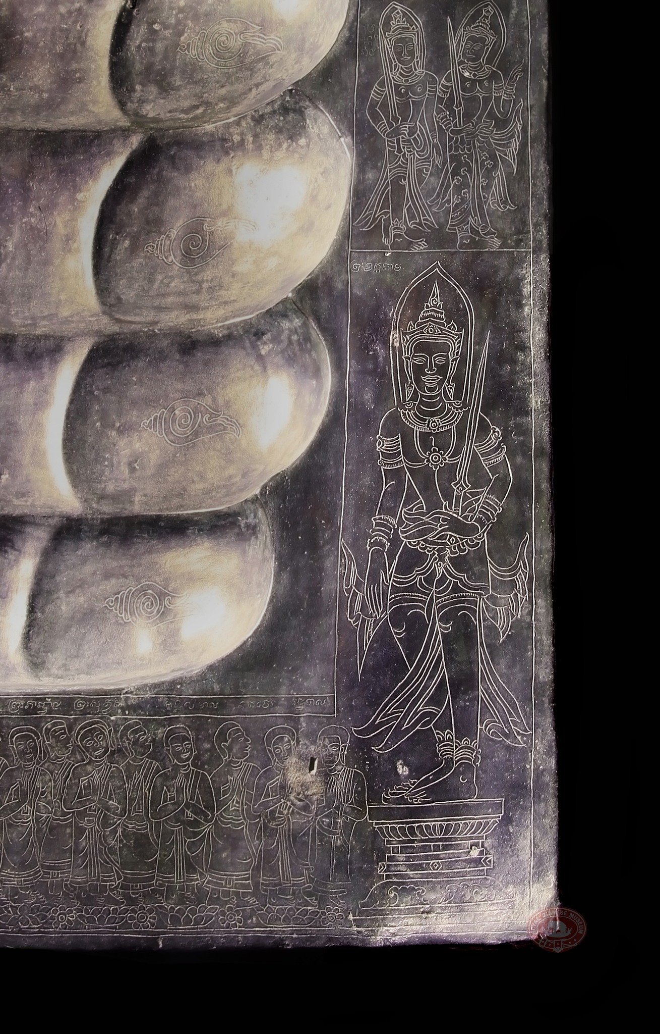 มุมขอบล่างแผ่นโลหะรูปรอยพระพุทธบาทสลักรูปบุคคลยืนบนแท่น ศีรษะสวมกรัณฑมงกุฎ ใบหน้ารูปไข่ ดวงตาเปิดมองตรง จมูกใหญ่ ริมฝีปากหนา คางเป็นปม รอบศีรษะมีรัศมี ลำตัวท่อนบนสวมเครื่องประดับ ได้แก่ กรองคอ สังวาล ทับทรวงรูปดอกไม้ พาหุรัด กำไลข้อมือ มือขวาแนบลำตัว มือซ้ายถือพระขรรค์ นุ่งผ้าสั้น สวมกำไลข้อเท้า ยืนอยู่บนฐานสิงห์ เหนือรูปสลักมีข้อความอักษรขอมสุโขทัย ภาษาไทย จารึกว่า “พระขตฺตคาม”