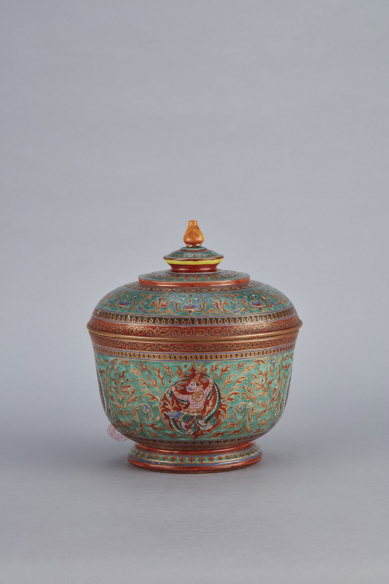 โถพร้อมฝา เบญจรงค์ลายหน้าขบและครุฑยุดนาค